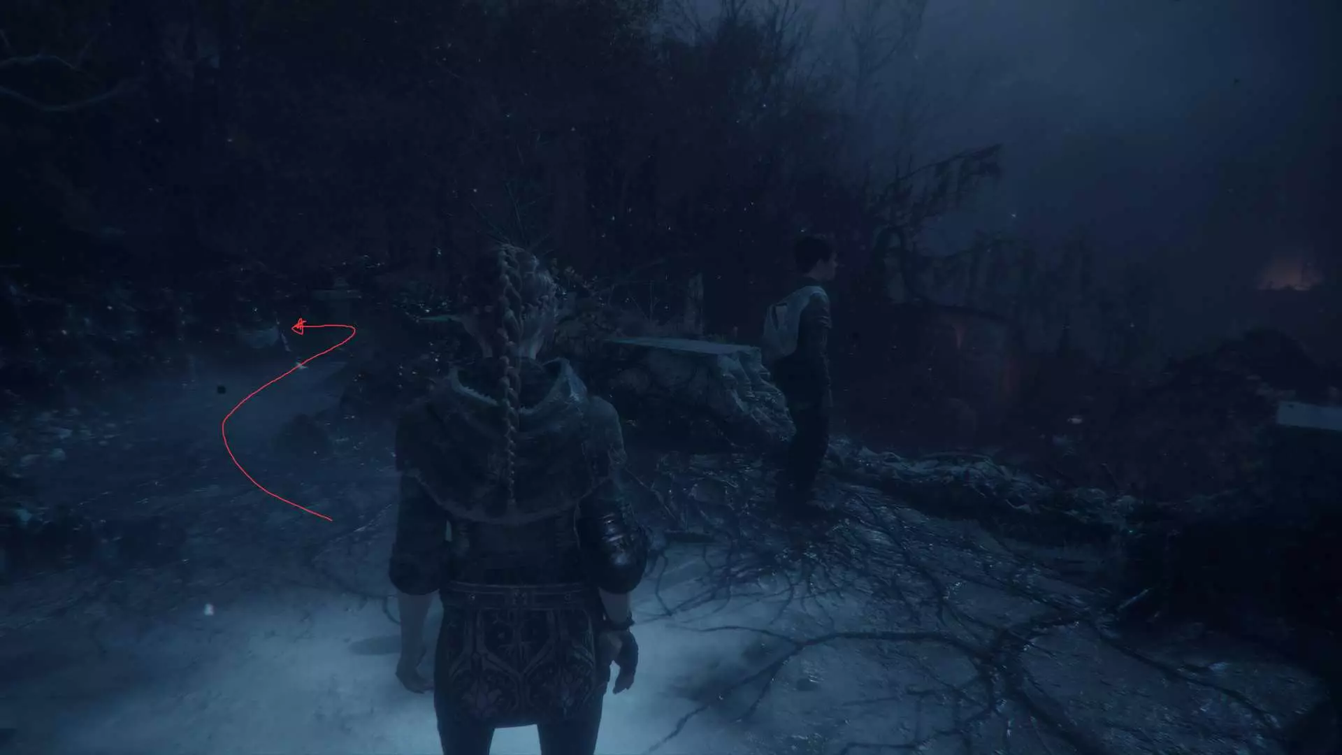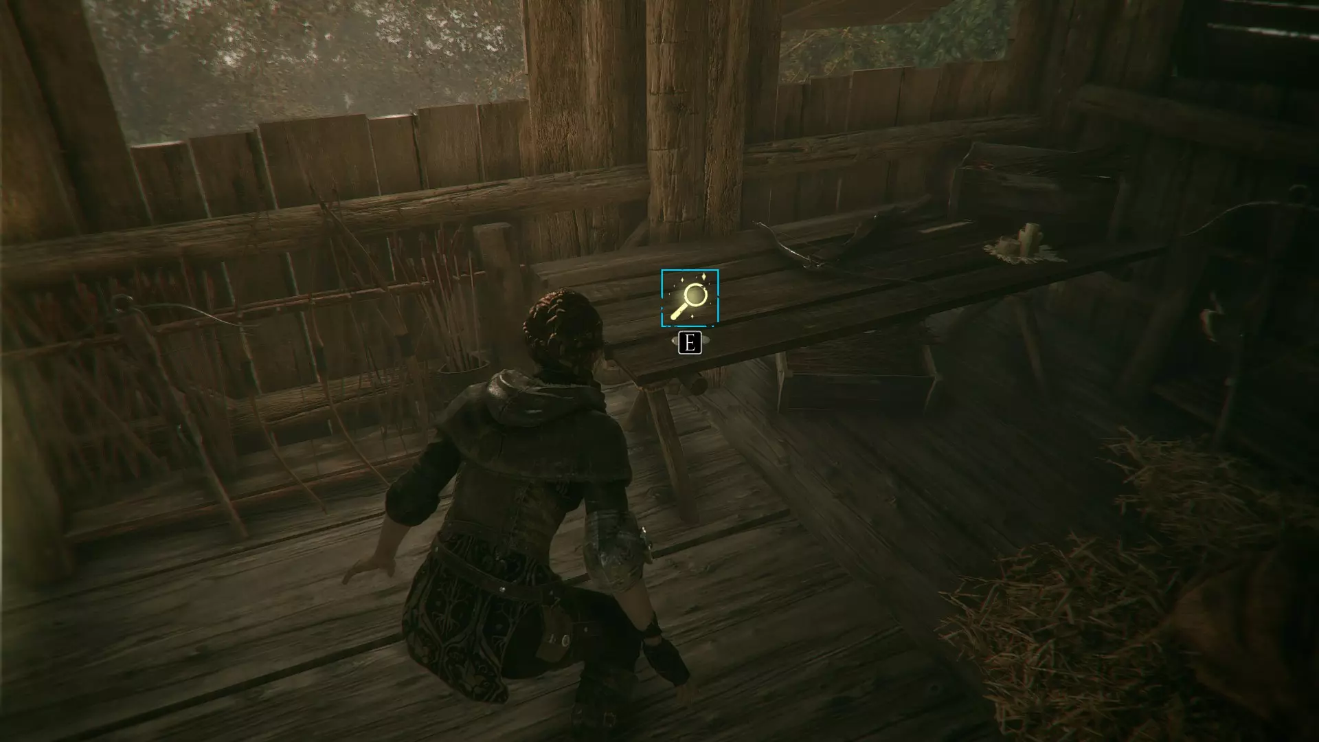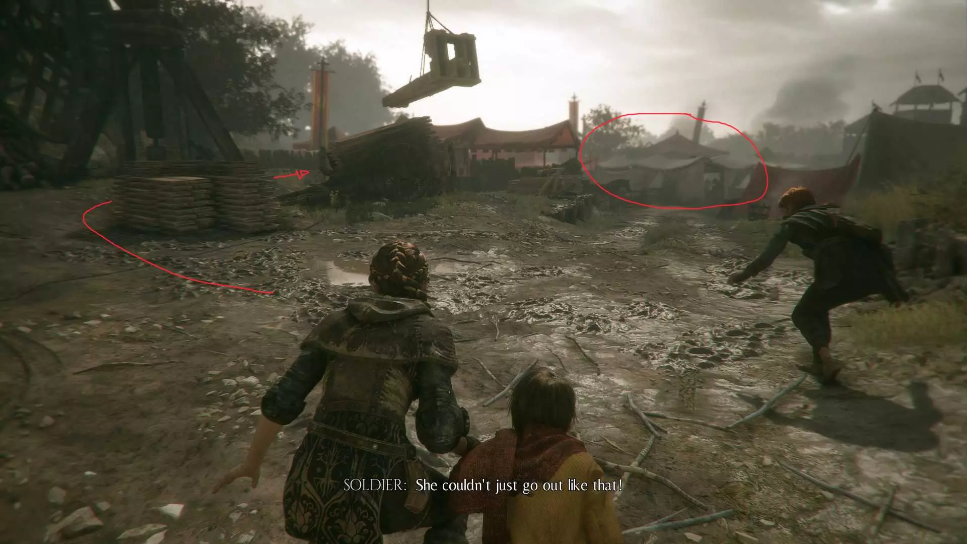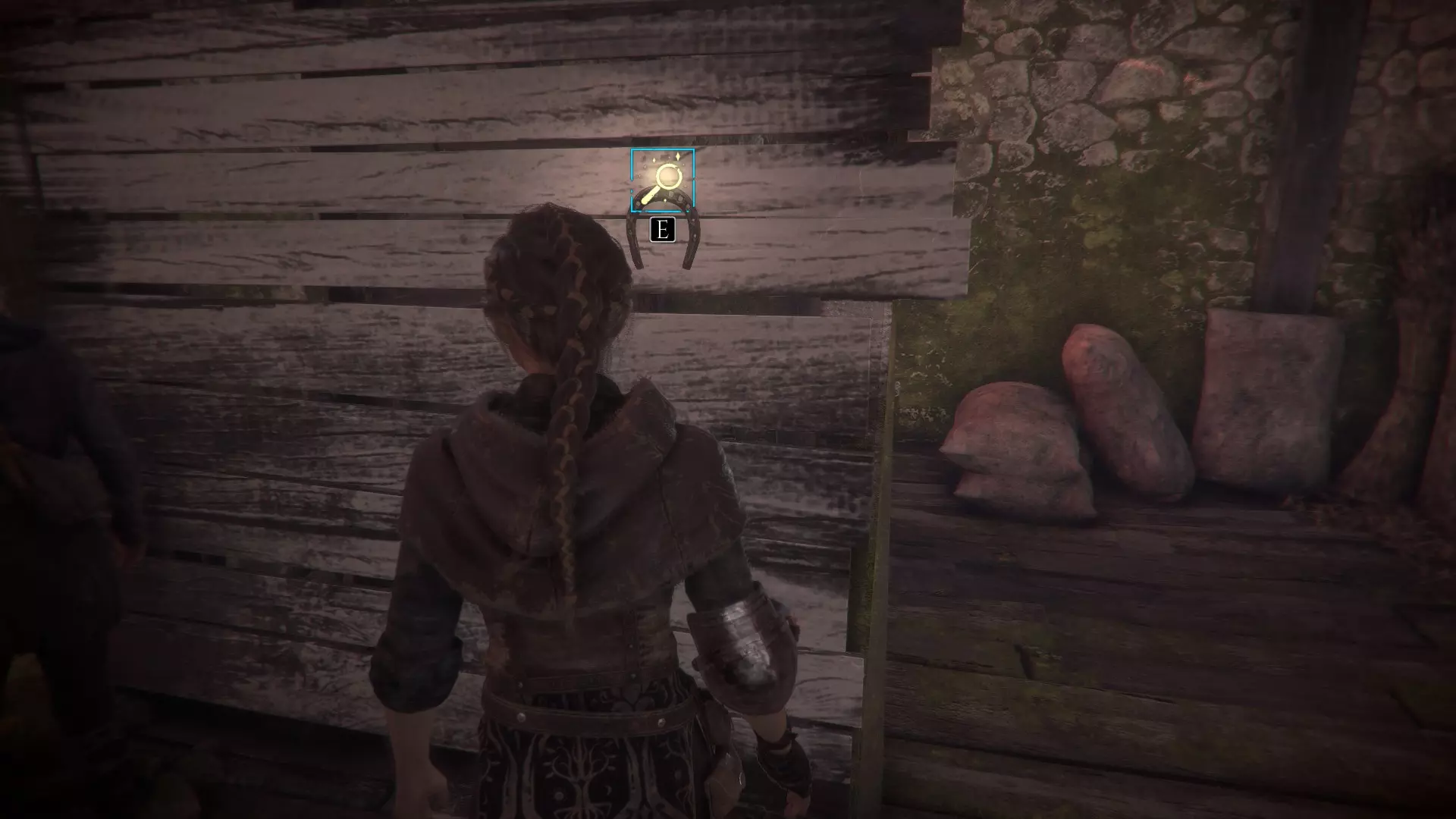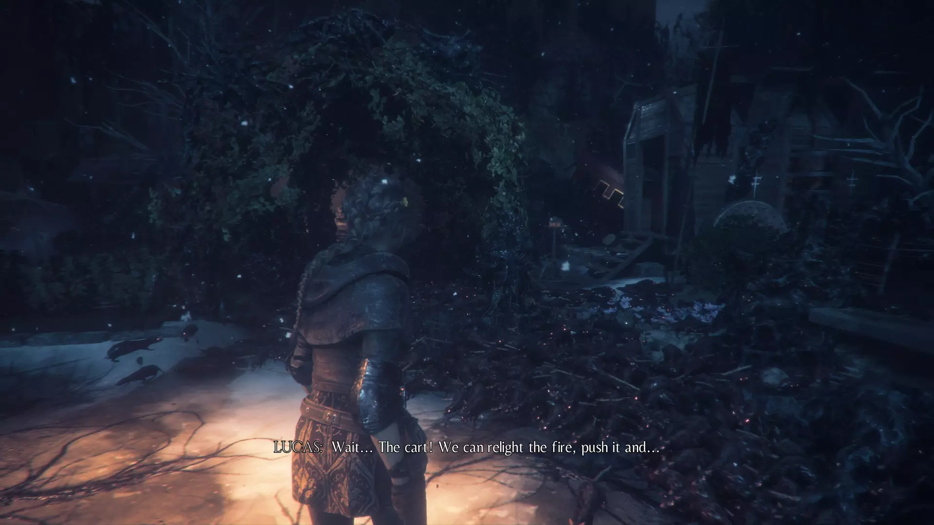 在指引卢卡斯操作附带燃烧篮的投石机的区域,雨果取回木棍后,点燃木棍并向右走到石围栏处。围栏内有一个可点燃的篝火、更多木棍,以及篝火旁的【压舱石】。