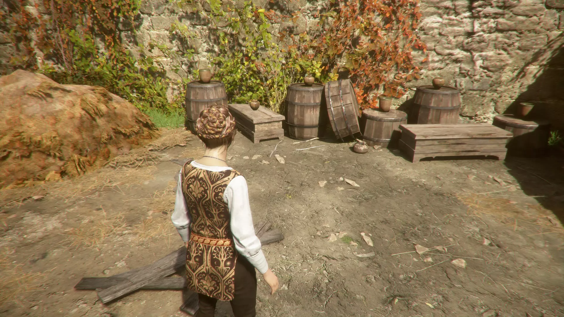 单独成就:More Practice 从章节开始的主城堡大门出发,直走并在墙边右转。穿过建筑来到马厩后院,找到那些靶子(成排放在桶上的花瓶),将它们全部摧毁。