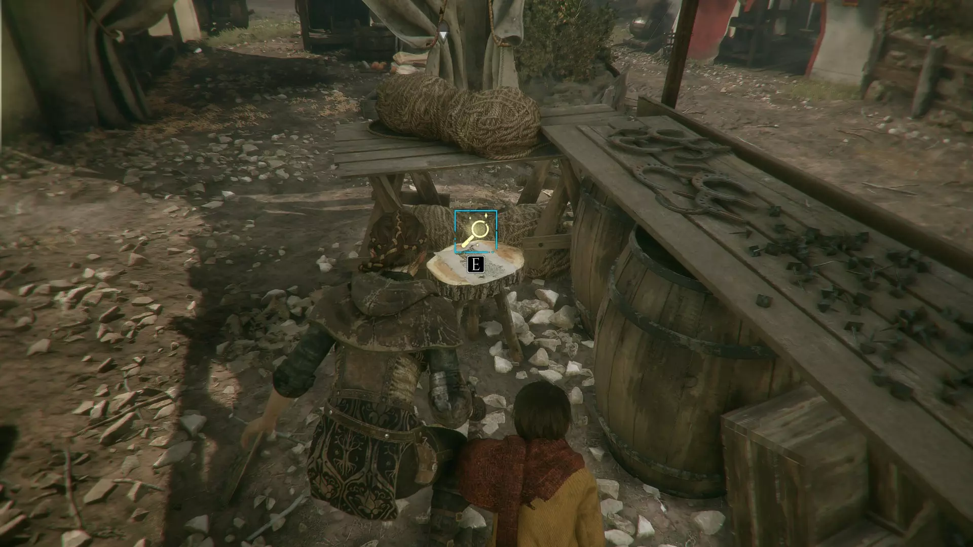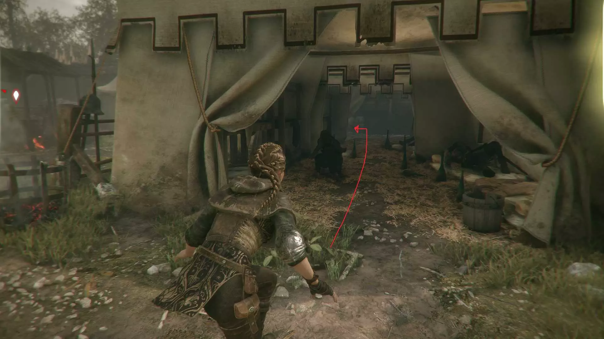 好奇心12 - 宣战 解救雨果后,在营地潜行时,从他的笼子向左穿过木材场。途中需要消灭挡路的士兵。目标是白色的敞边帐篷,物品放在凳子上。