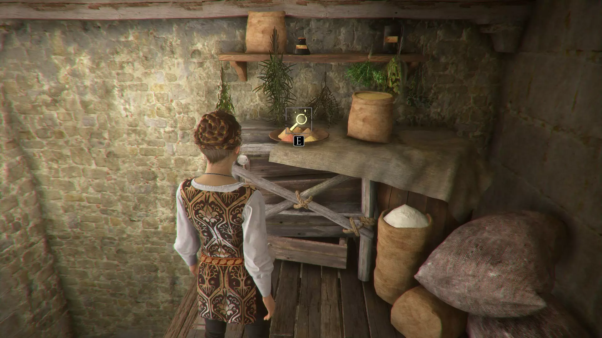 好奇心1 - 香料 进入房子的主入口后,向右走。穿过餐厅,进入储藏室。在通往厨房的门前有一个梯子。爬上梯子,沿着走道一直向左走,香料就在桌子上。