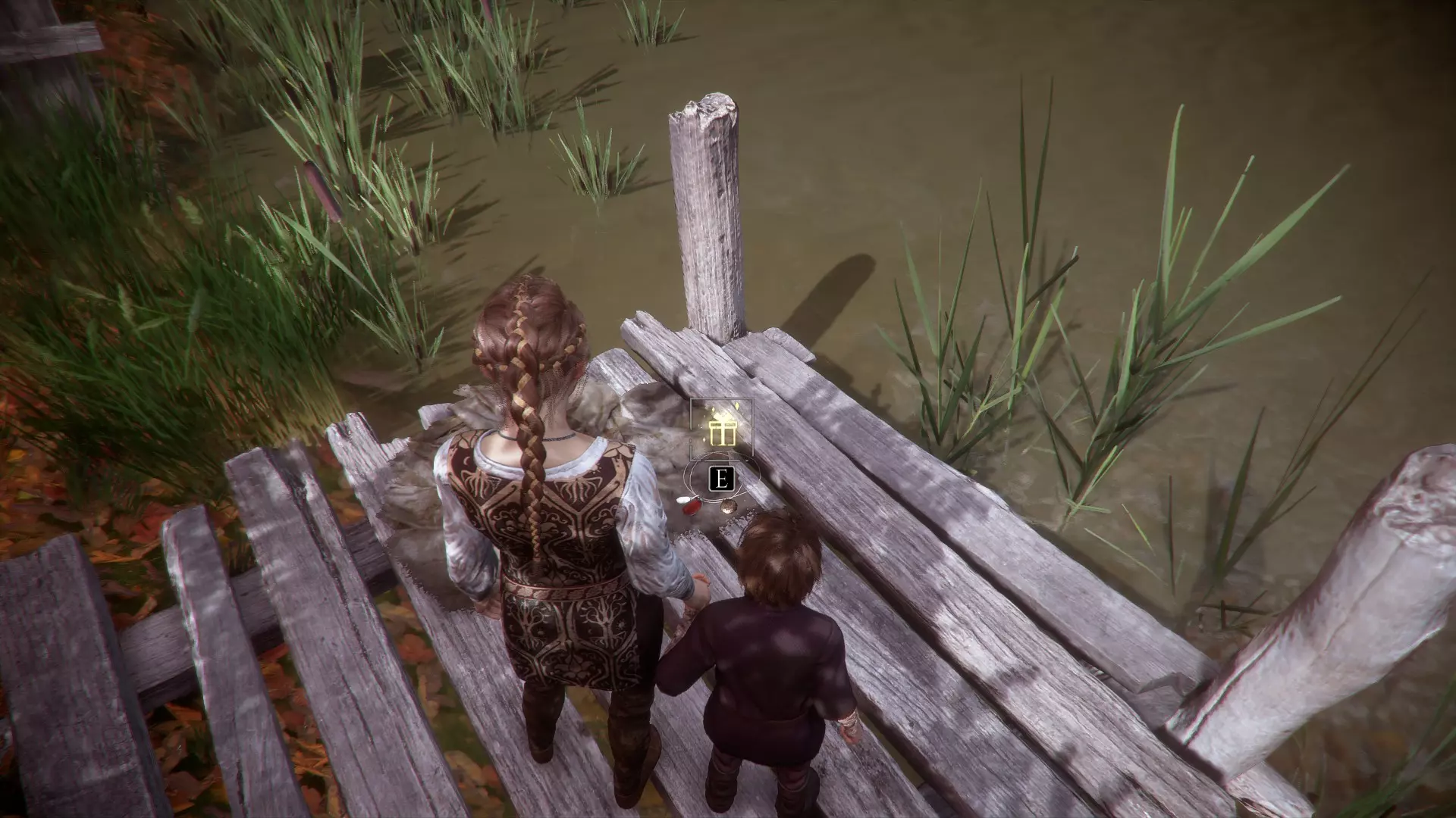 第二章 - 陌生人 礼物2 护身符 到达村庄后,在市场摊位前,沿着河边向右走。会有一个建在水上的码头,沿着码头往下走。你的左边,柱子附近的木板上会有一条项链。