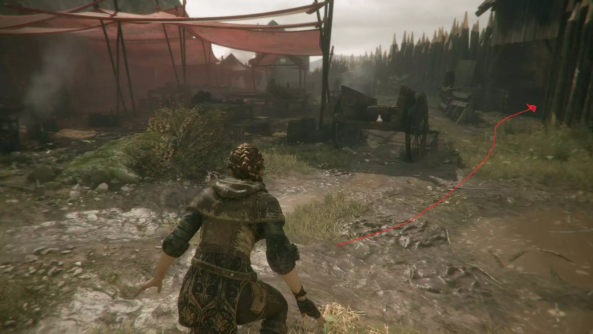 第16章 - 加冕 炼金术士推车5 在你与梅莉和卢卡斯分开,并让罗德里克杀死剩余士兵后,沿着你右侧的路前进。你会遇到一扇带有白色X标记的门,以及一个挂着白布的栅栏。向右转。在小路尽头向左转,杀死守卫,炼金术士推车就在路的尽头。