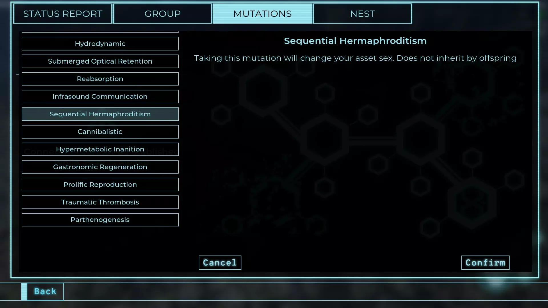 顺序雌雄同体/性两性变异 简称:SH 获取槽位→全部 效果【获取时变更性别】 可在性别错误时或创建巢穴时使用
