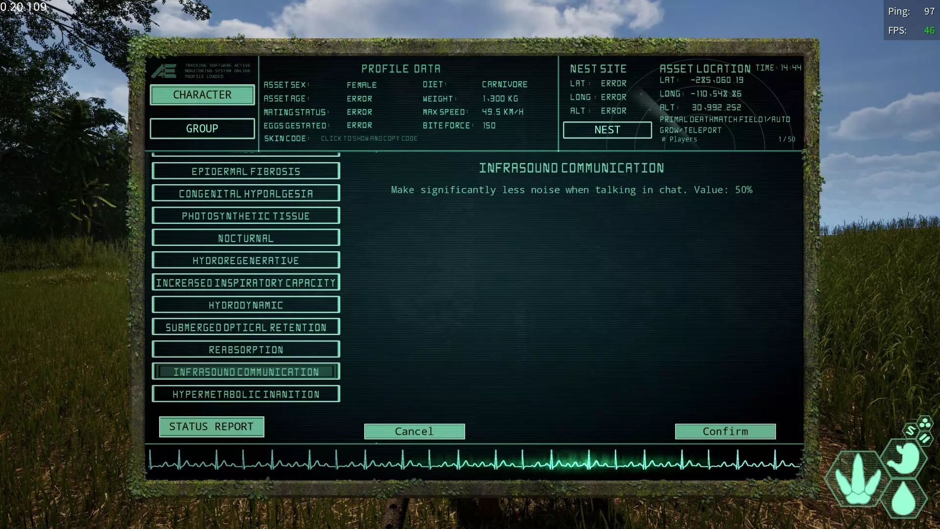 低周声通讯(Infrasound Communication) 简称:IC 获取槽位→全部 效果【降低聊天呼叫的音量】 即使音量减半也还是会发出声音,很容易被发现 几乎没有使用用途。