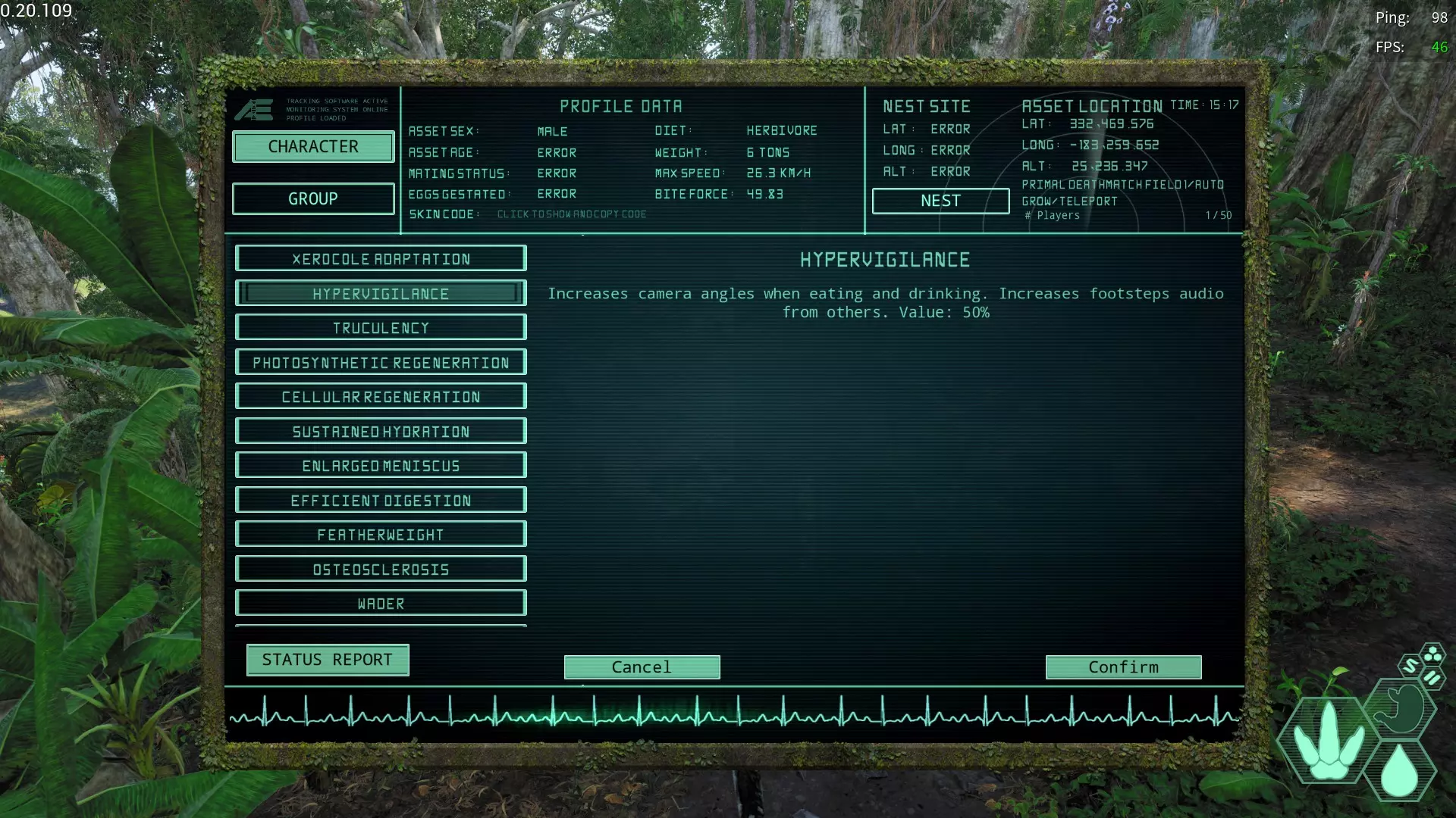 警戒心增加变异(Hypervigilance) 简称:HV 适用槽位:全部 效果:进食、补充水分时的相机角度上升,更容易听到肉食恐龙的脚步声和叫声 适合新手使用,熟悉游戏后会逐渐失去作用