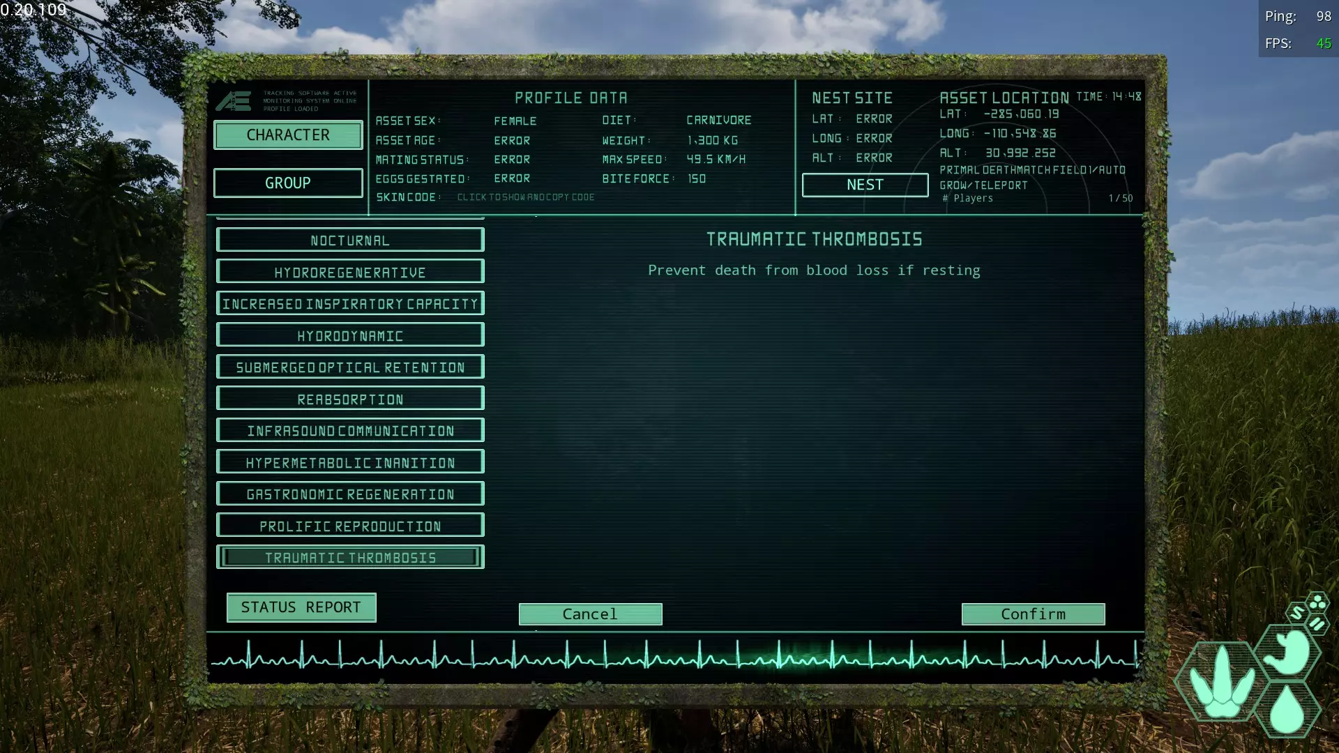 创伤性血栓/凝固血栓变异 简称:TT 获取槽位→偶数槽位 效果【坐下后不会因出血死亡】 与 Carnotaurus 等出血抗性较低的生物相性良好 精神上也能更从容。