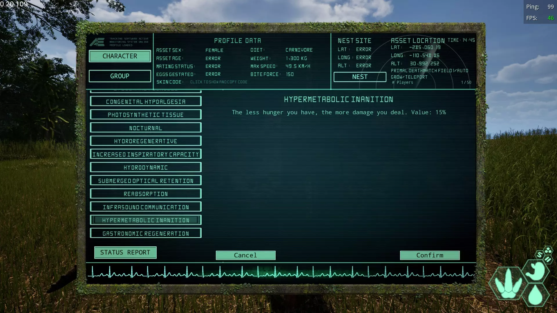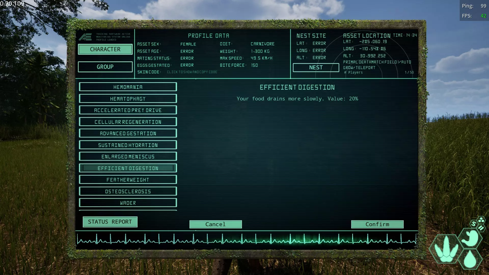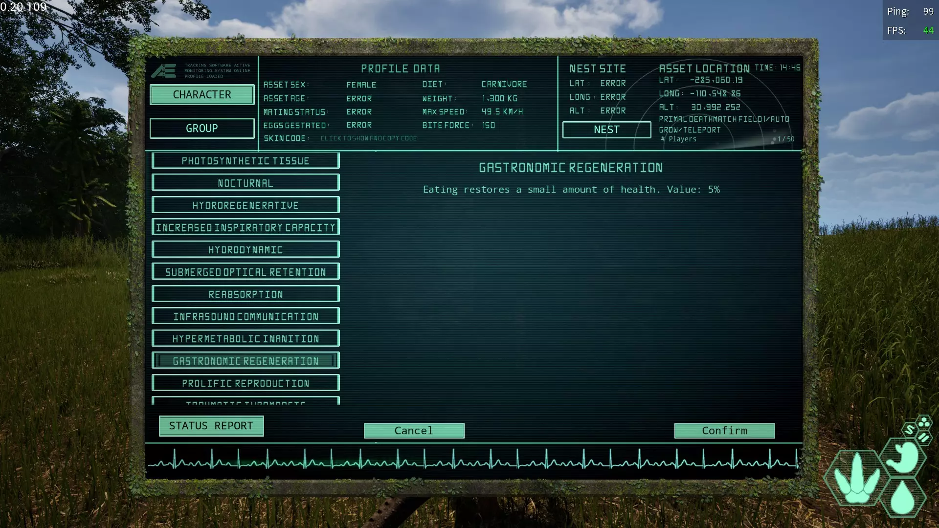 偶数槽限定变异↓ 只能在第二个槽位解锁,但效果强大的变异。 ☆过食再生变异(Gastronomic Regeneration) 简称:GR 获取槽位→偶数槽 效果【恢复食物值时也会恢复生命值。】 根据食物值的恢复量进行恢复。 即使只吃7~8秒也能恢复相当多的生命值。 恢复速度明显快于坐下休息,因此肉食恐龙必备。