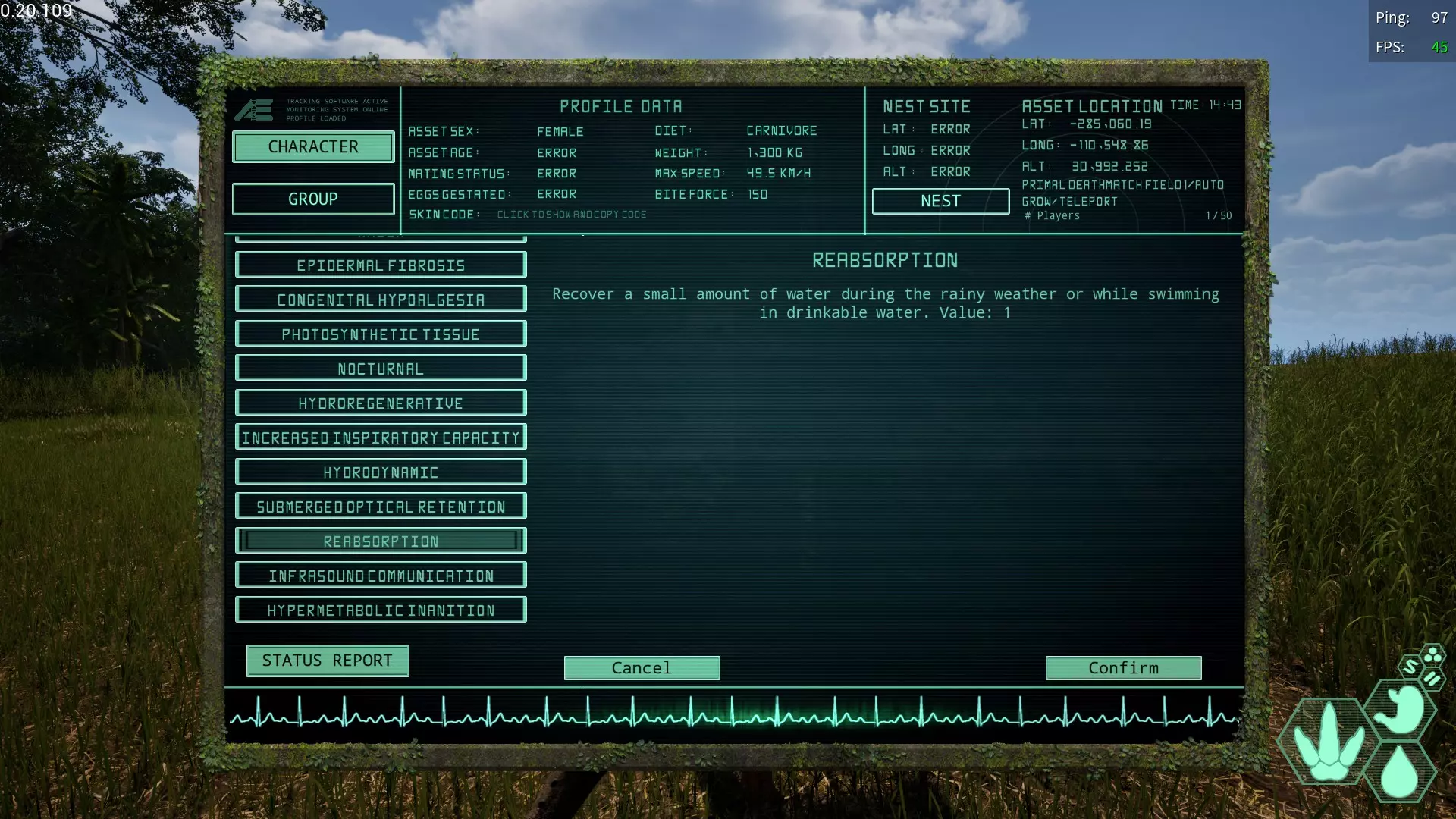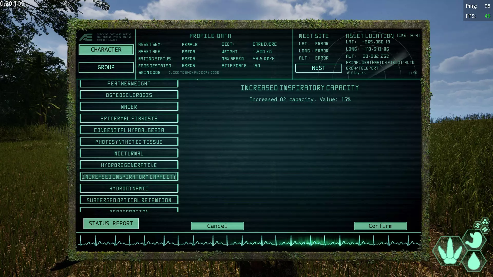 增加吸气容量/肺脏肥大变异 简称:II 获取槽位→全部 效果【增加氧气量】 对部分半水生生物有一定作用,其他生物则不需要
