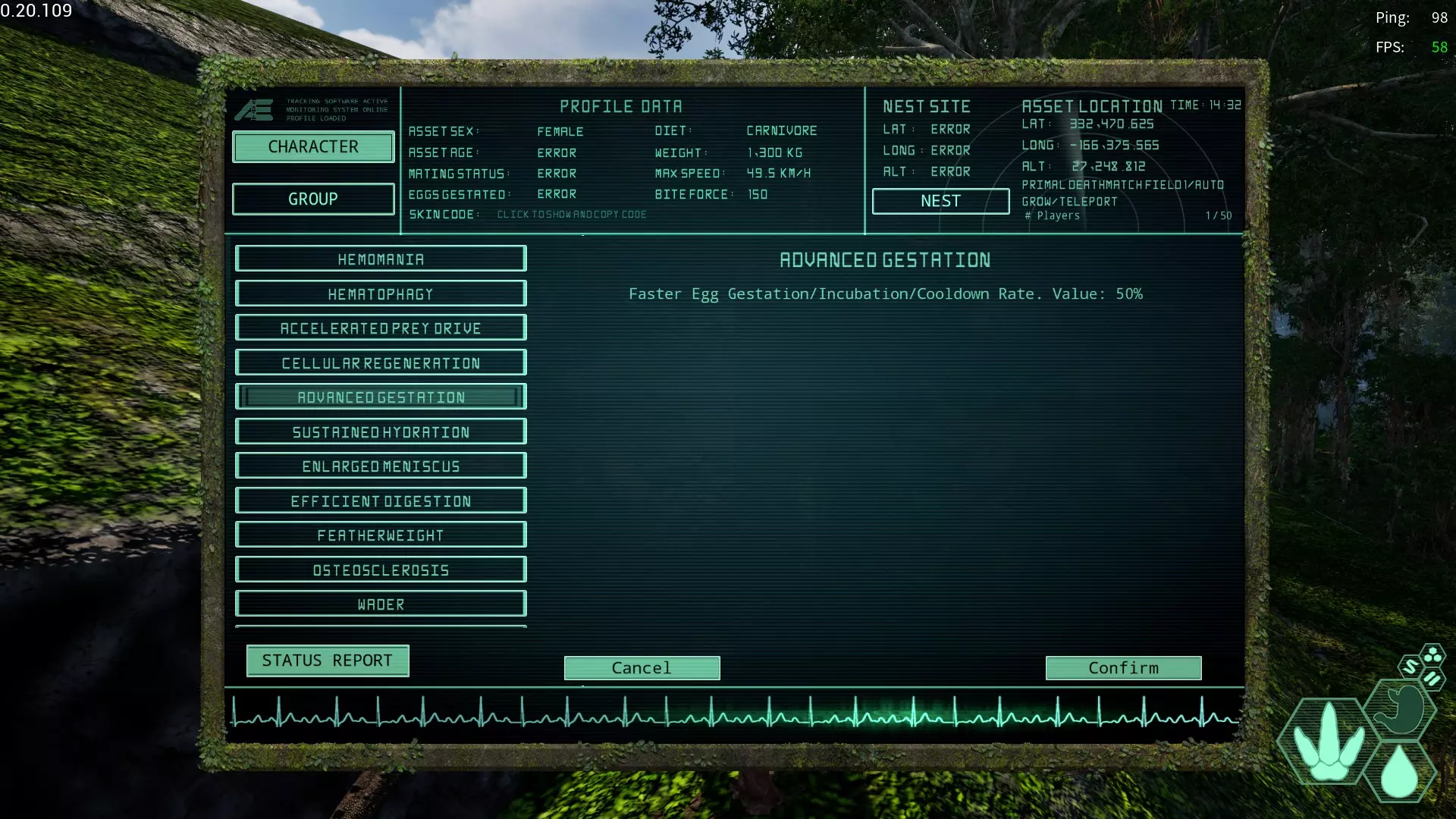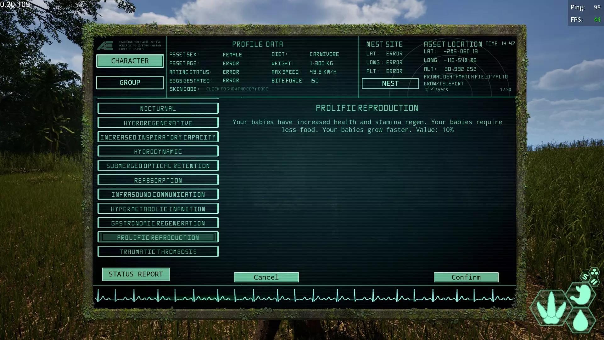 种内捕食变异 获取槽位→偶数槽位 效果:使不可同类相食的生物可以进行同类相食 推荐给难以获取营养、需要大量食物的生物 获取后体色色素会受损并白化 繁殖增加变异 简称:PE 获取槽位→雌性限定、偶数槽位 效果:自身幼崽的体力和耐力恢复率上升,所需食物数量减少,成长速度加快 推荐给产卵较多或多次筑巢的生物