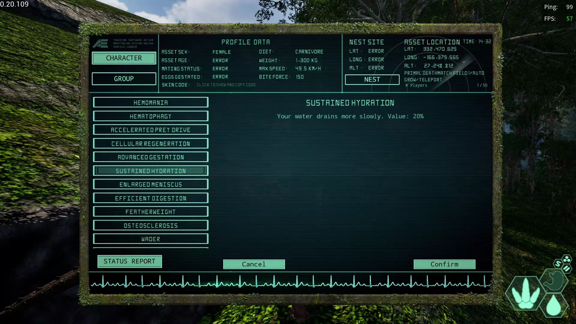 持续水分变异(Sustained Hydration,略称:SH) 适用槽位:全部 效果:减缓水分值的下降速度 陆地生物受益不大,但对于水分消耗较快的生物(如副栉龙、双脊龙)较为适用。