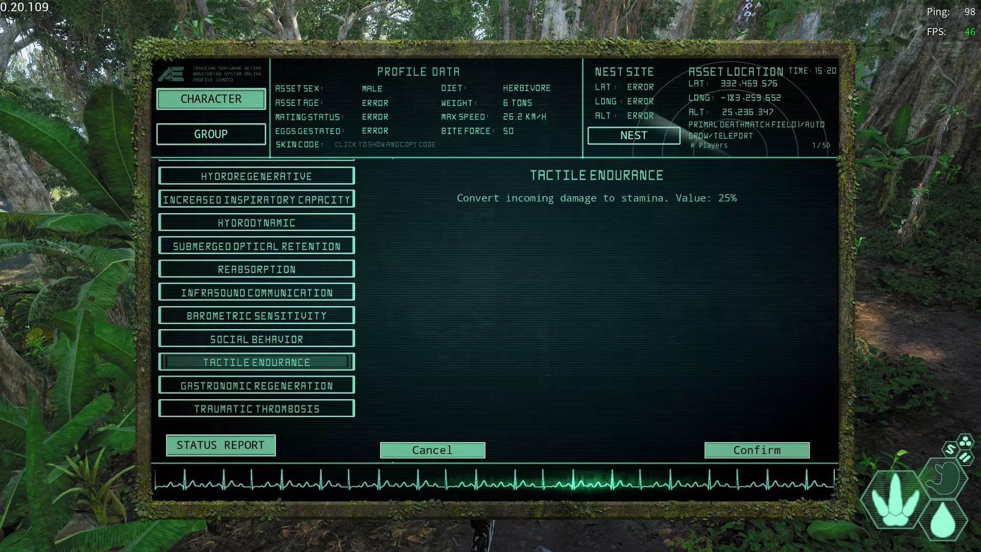 【痛觉耐久变异】(Tactile Endurance) 简称:TE 获取槽位:偶数槽位 效果:受到伤害时恢复耐力。 对于消耗耐力战斗的生物来说是必备变异。 根据受到的伤害量恢复耐力。 ※生命值较低的生物可能在恢复前就死亡,因此推荐中型、大型生物使用。
