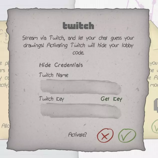输入您的Twitch账号名称。 输入Twitch连接密钥。如需获取,请点击【获取密钥】。 此时会打开浏览器窗口,您可以在其中复制密钥。 点击【激活?】并确认通知。 恭喜,Twitch模式现已激活!您应该会在模式选择中看到【Twitch已连接】,并且您的大厅代码会自动消失! 现在当您开始Twitch直播《你画我猜》时,游戏将邀请您的直播间观众一起游玩,观众在聊天中提交的答案会被纳入游戏。