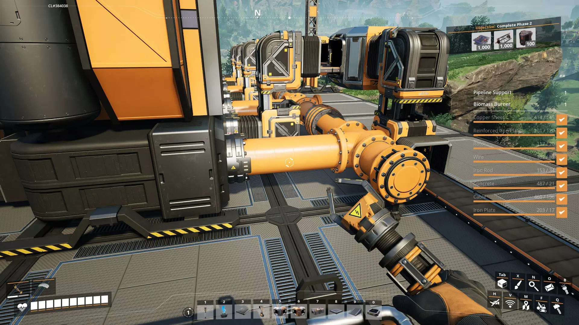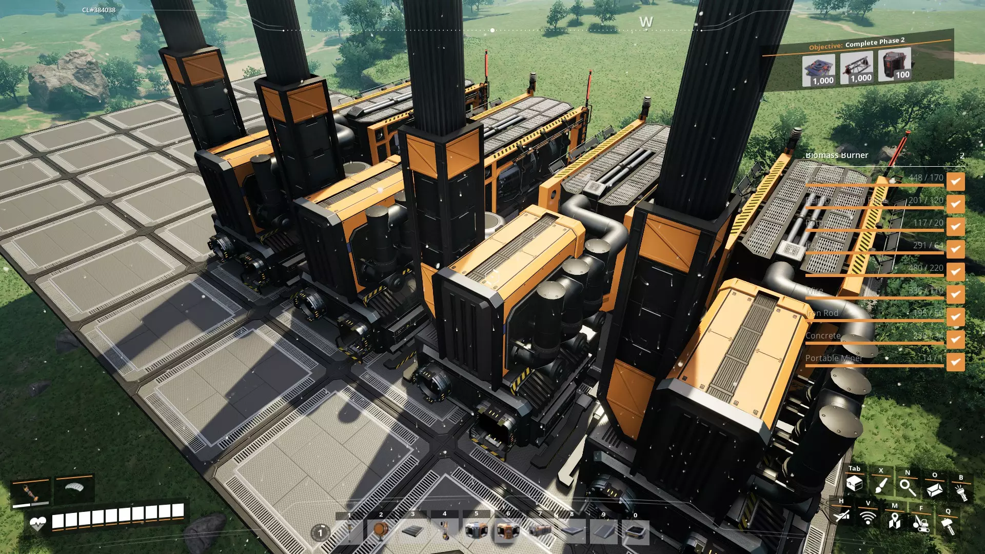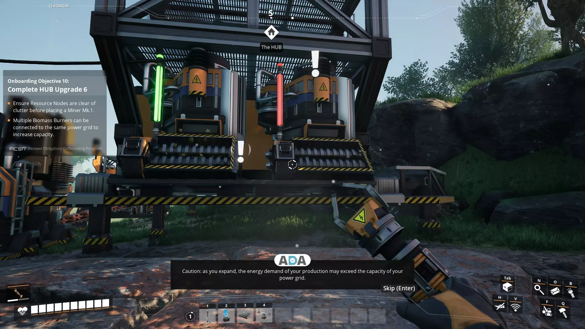 5. 在采矿点附近建造工作台。你可以在等待手动采矿机填满资源时,同时制作锭/混凝土。 6. 找到各个资源点后,你可以将枢纽重新安置在它们之间的等距离位置。只需拆解(F键)并重建即可。 7. 可能不太明显,但当你将枢纽升级到5级时,会在枢纽上获得一个额外的生物质燃烧器,同时还会获得一个电线杆。放置电线杆并将两个生物质燃烧器都连接到它,然后从这里将电力连接到你的其他机器。这将使你的电力翻倍。