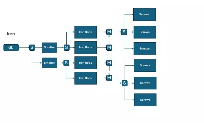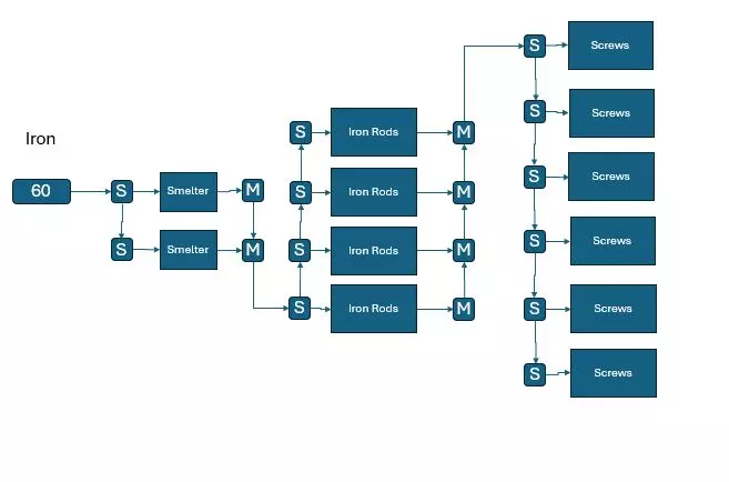 这需要分别为转子和强化铁板各使用两个装配机,它们会先合并,然后分流,为每种零件创建一个存储区,之后再继续输送到智能镀层的装配机。 这样做的好处是,建造更多装配机肯定需要大量的强化铁板和转子,而这种设置会为你创建一个存储区。你可以轻松地将这些零件输送回你的“零件中心”,在这里可以与其他所有零件一起取用。 如果你按照上述第一种方式操作,可能会将所有转子和强化铁板都用于智能镀层,导致需要时却没有可用的了。 你将需要数千个智能镀层。 汇流管线是一种生产零件并减少零件输送路径的好方法。它们最终也是可扩展的,前提是你在生产线末端留出足够空间来添加更多机器。 以铁棒和螺丝钉为例: 假设一个普通纯度的铁矿节点,使用MK1采矿机,每分钟可产出60个铁矿石(60/分钟)。 熔炉每分钟需要30个矿石,每分钟产出30个铁锭(30/分钟)。 制造铁棒的建造器每分钟需要15个铁锭,每分钟产出15个铁棒(15/分钟)。 因此,一个熔炉可以通过分流器为两个建造器供料。 制造螺丝钉每分钟需要10个铁棒(10/分钟),每分钟产出4个螺丝钉。 所以两个铁棒建造器可以为3个螺丝钉建造器供料。 如果我们按照常规思路来尝试搭建,大概会是这样的: