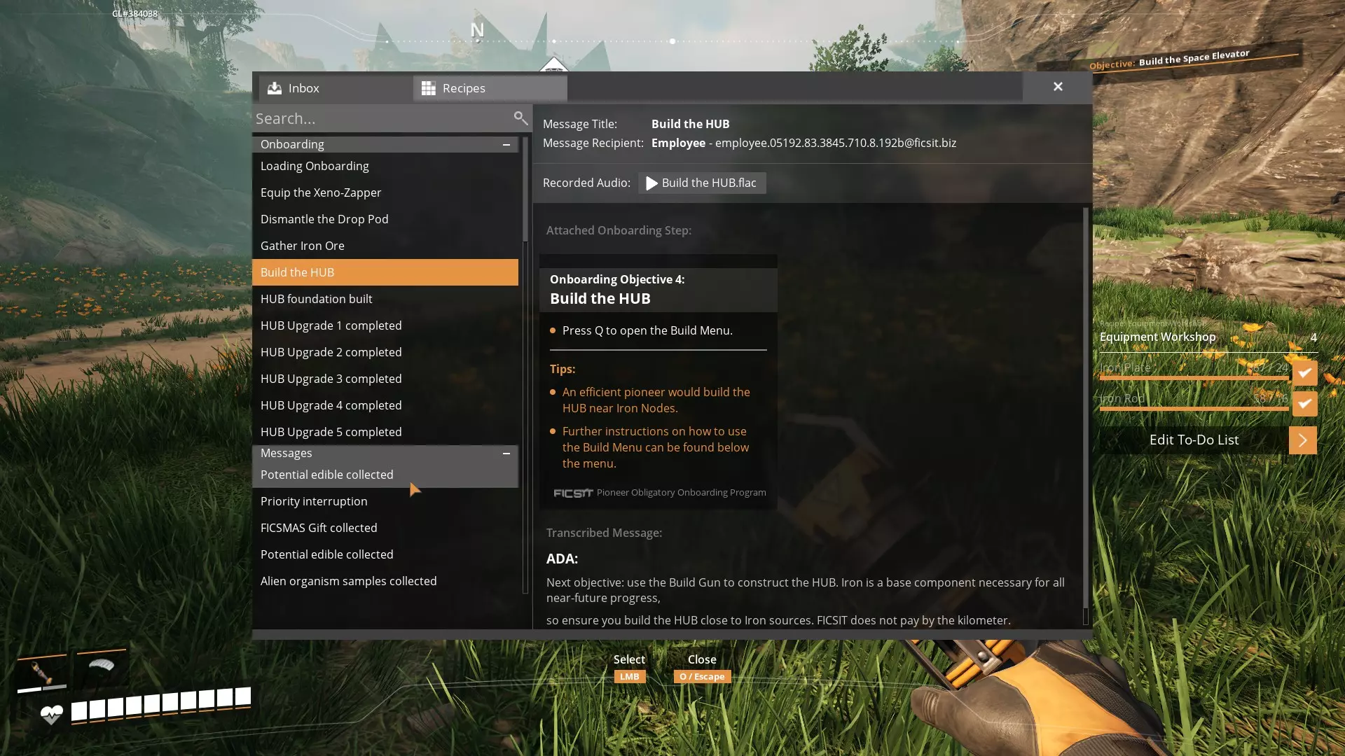 这是一份游戏指南,将为你详细解读这款游戏,让你能有更多时间投入游玩,而不是在论坛和维基百科上花费时间。 设定预期: 这款游戏的首次通关很容易就需要150-200小时。在后续的周目中,由于你不仅知道会发生什么,还知道何时会发生,因此可以缩短通关时间。但对于你的首次游玩,绝对会是一场盛宴!这款游戏能让时间悄然流逝,是让你沉浸在游戏世界中的绝佳方式。 游戏世界是手工打造的,景象令人叹为观止。它是一个非常庞大的世界,拥有许多独特的生物群系,以及众多危险的生物,这些生物会让你多次体验“跑尸”的乐趣。这也是一款工厂建造类游戏——你将从在制作台上手动制造10个、20个、50个物品开始,到游戏后期,你会实现所有流程的自动化,基础物资的产量将达到每分钟900个以上,以供应你不断扩张、生产更复杂物品的工厂。 本指南将带你了解到第三阶段——当你首次获得煤炭并启动第一台燃煤发电机时。一旦达到这个阶段,你就不再是新手拓荒者了! 如何使用本指南 本指南按时间顺序从引导教程一直介绍到第三阶段。你可以参考与你当前游戏进度相近的部分。 或者,如果你想提前了解接下来会发生什么,也可以先阅读后面的内容。选择权在你手中!开始游戏 首次启动游戏时,前2-3小时是相当不错的教程,会指导你学习如何寻找地表矿藏、基础采矿方法,并介绍各种工厂相关设施,如传送带、存储装置和电力系统。 因此,我强烈建议你不要选择【跳至1级】,而是从游戏初始阶段完整体验。 游戏初期在教授基础知识的同时,过程可能有些单调。你需要四处跑动收集矿物,拾取树枝和灌木来制作生物质以发电,整体感觉非常依赖手动操作。这部分很快就会过去,之后你就能自动化很多事情了——但未来仍需要手动收集,所以必须学会它的运作方式。请耐心一点。 选择起始位置——我强烈建议你选择草地或岩石沙漠。 首先 1. 你会有一个名为艾达的人工智能伙伴,她风趣、爱挖苦人,还有点居高临下。当你外出活动或研究新东西时,她会不停地说话,你可能会错过她的话。你可以按O键并选择收件箱来查看她所说过的所有内容的历史记录。