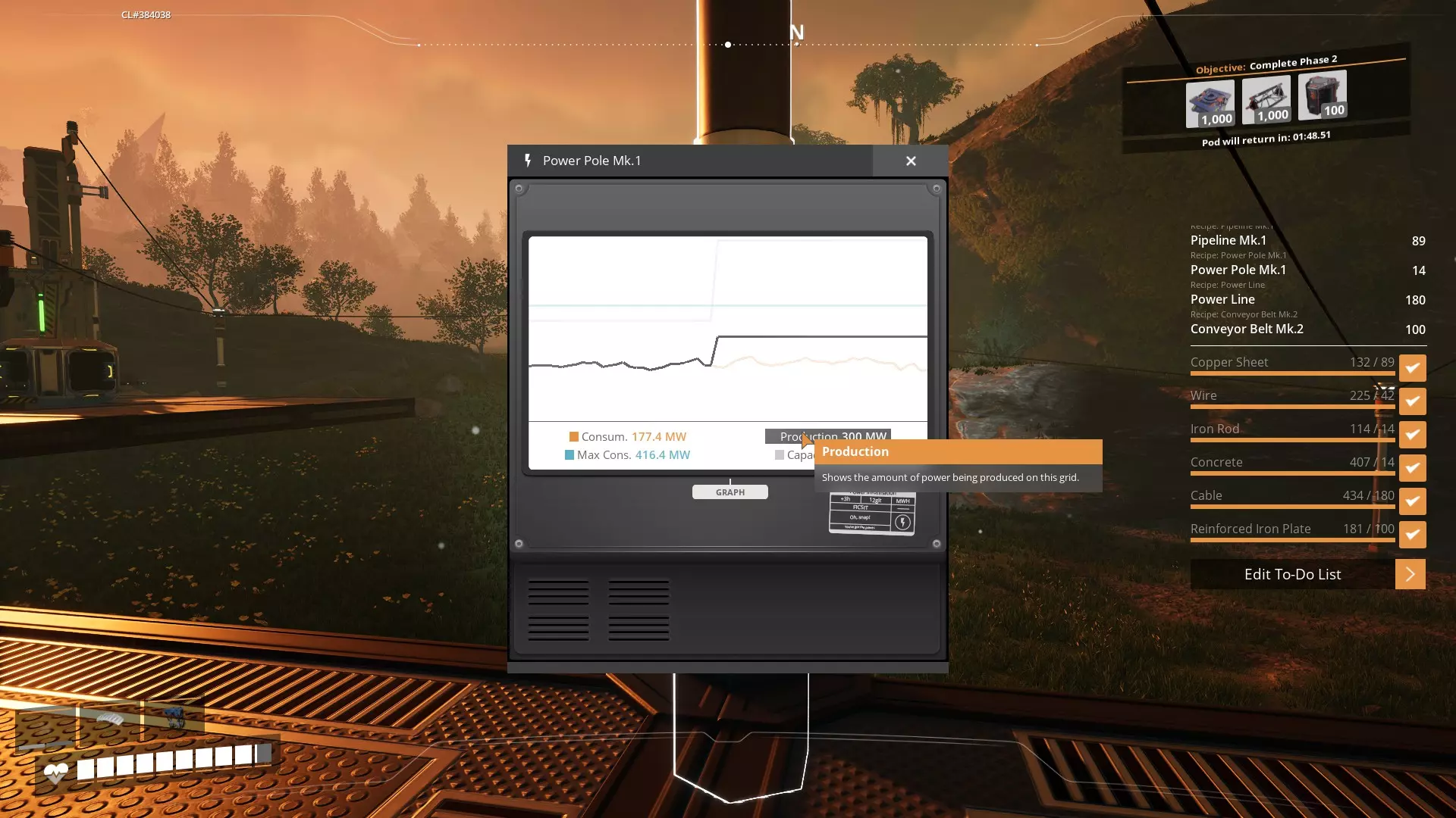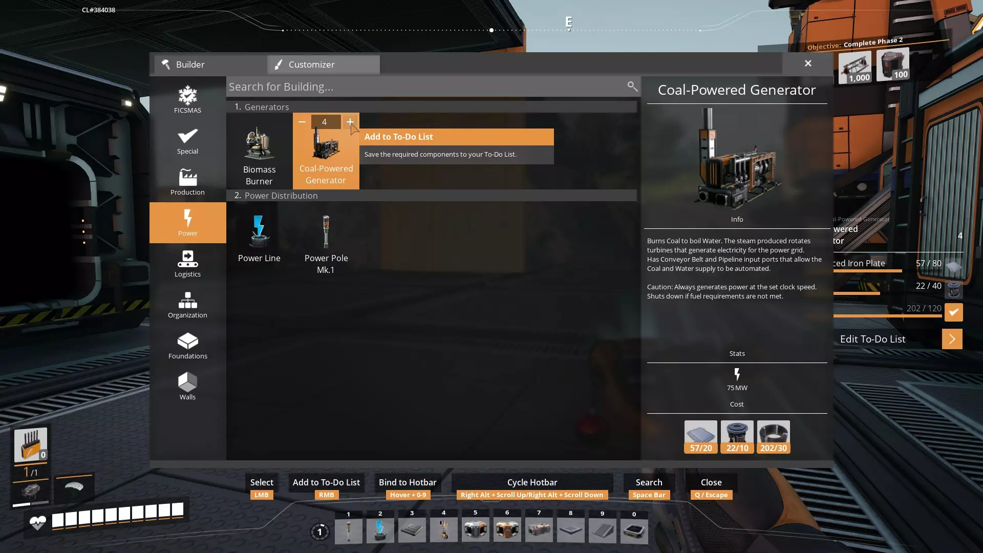 顶部有一张煤炭的图片,旁边显示43(这是燃煤发电厂的库存数量),下方写着1煤炭15每分钟。水的显示类似,为35.8/50(总容量50,当前持有35.8),下方是45/分钟。 这些数据(煤炭15/分钟和水45/分钟)是燃煤发电厂持续运行所需的量。 如果你找到一个煤炭资源节点,普通节点在没有任何超频的情况下产量为60/分钟。更重要的是,你的MK1传送带容量为60/分钟(你可能没有足够的强化铁板来制作从矿场到燃煤发电厂的MK2传送带)。 因此,如果单个燃煤发电厂需要15/分钟的煤炭,而你能用一条MK1传送带充分供应60/分钟,那么你可以为4个发电厂供应煤炭(15×4=60)。关于水泵,单个水泵的产能为120/分钟。4座发电厂的总需求为(45×4=180/分钟)。因此,你需要1.5个水泵。你可以建造1个水泵并将其超频至150%,或者建造2个水泵并将其中1个降频至50%(推荐此方法)。 玩家间流传着一个玩笑:玩《幸福工厂》的玩家在键盘和鼠标之间放着一个计算器,而这并非玩笑。如果你想完全理解如何为工厂(燃煤发电厂就是一种生产电力的工厂)配置负载,你需要掌握数学知识,计算负载会成为你的本能。 燃煤发电 - 任务清单 任务清单功能非常实用,你应该习惯在游戏中使用这一功能。它能让你提前规划好所有需要的物品,立即告诉你是否拥有足够的各类材料来实际建造,并且在你建造这些物品时,会将它们从清单中移除。 我认为【燃煤发电站】是开始使用此功能的绝佳选择,因为你可能需要长途跋涉才能搭建好它,而使用待办清单有望减少返回基地获取更多材料和零件的次数。 使用待办清单的方法: 通过Q键调出建造菜单后,每个可建造的部件在其图标右上角都有一个“+”号。你可以点击它,每点击一次添加一个;按住Shift键点击,每点击一次添加10个;按住Ctrl键点击,每点击一次添加100个。当你执行此操作时,右侧会出现一个“待办事项”列表,其中包含所有需要建造的物品及其相关零件。该列表会持续累加这些内容,因此你可以看到每个物品所需零件的总数量,并且能立即清楚自己缺少哪些零件。