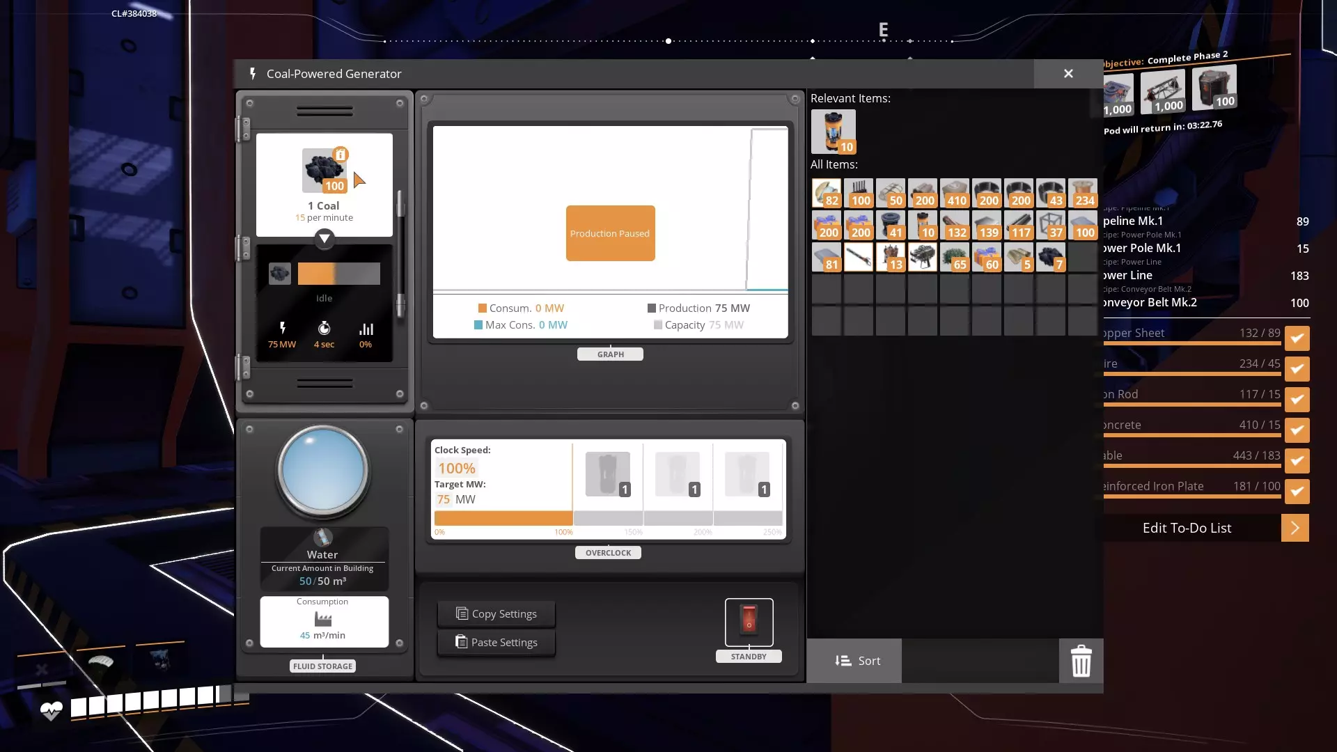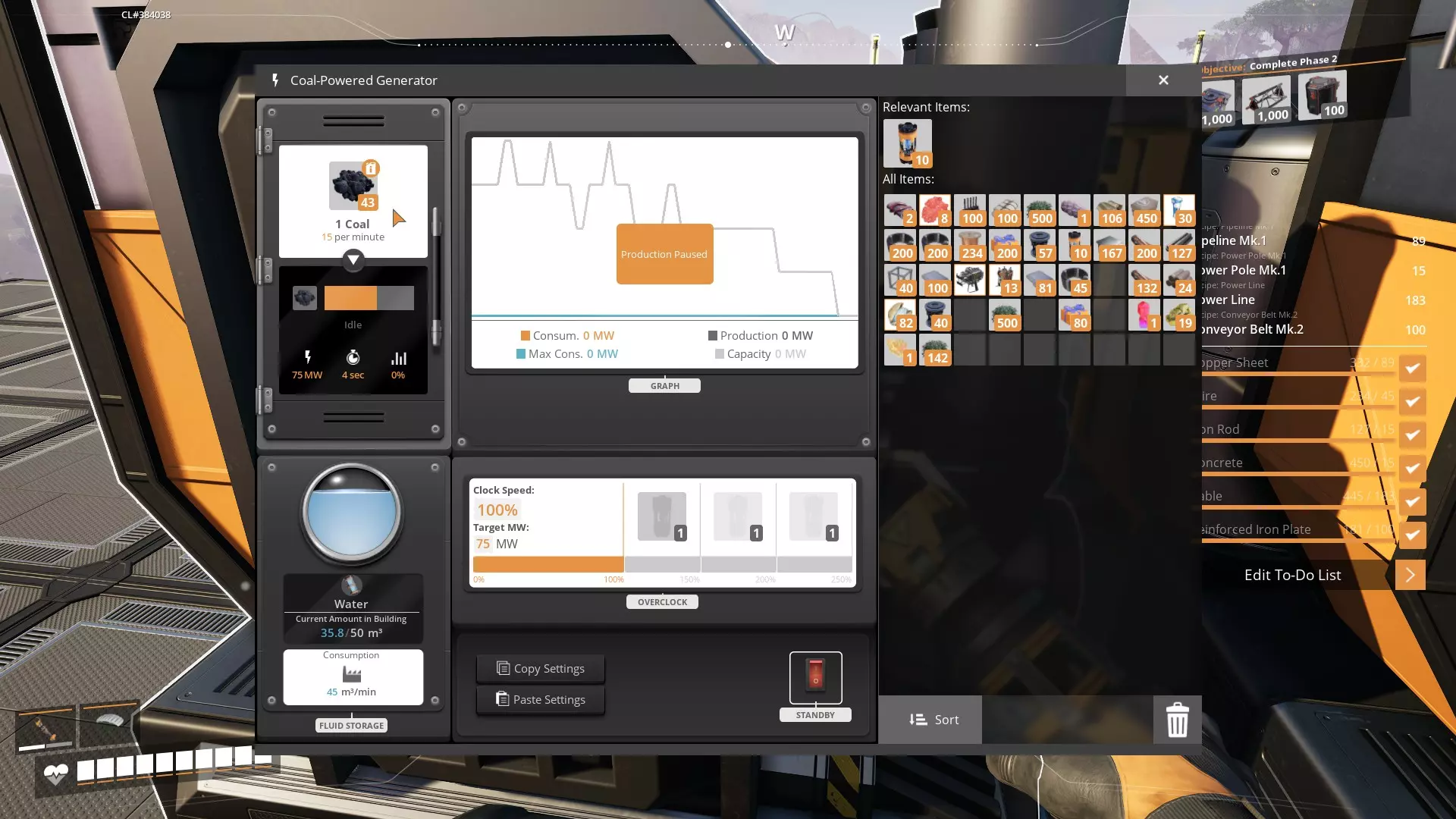 现在需要适应液体和材料供给发电机时的一些调整。它们非常不稳定,社区发现的一个减少不稳定性的方法是:暂停所有发电机,直到所有机器的煤炭和水都完全填满。 沿着生产线操作,对每台煤炭发电机按下【待机】按钮,将其设为暂停状态。