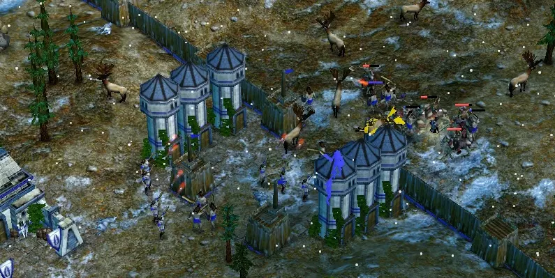 在游戏开始的前几分钟,你会遭到一群狼的袭击,这些狼可以立即转化为食物资源。 主要的防御策略和军队组建将是AI游戏的一部分——建造开放式的城墙和塔楼防御工事。 游戏初期资源会非常匮乏,军队也不足以击退所有敌方单位。我们要利用城镇中心作为掩护,并尽快重建塔楼和城墙防御。