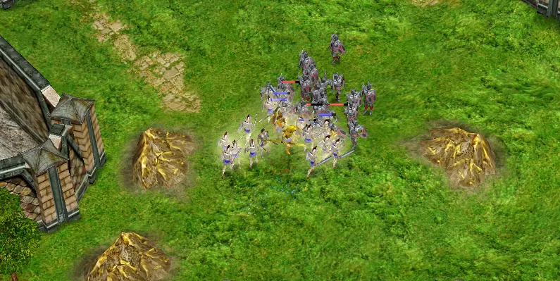 借助英勇技能,我们可以创造更多英雄,并穿越机械大军,前往第一批农民所在地。成功反击后,我们派遣战士前往西边的营地获取增援。