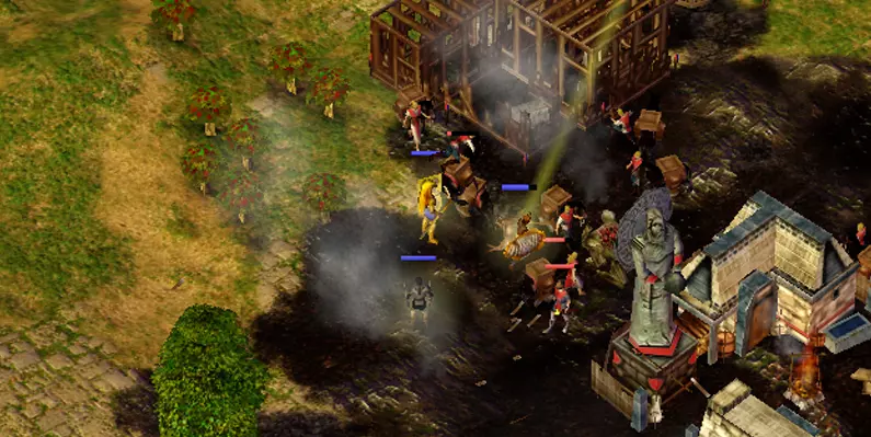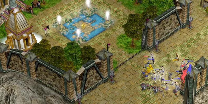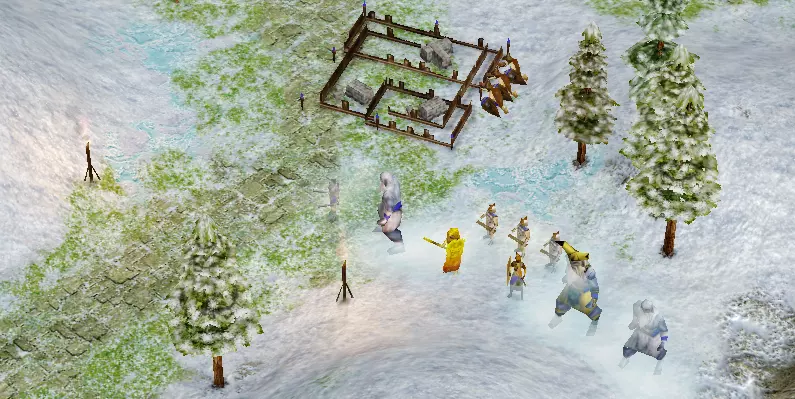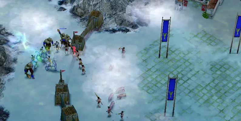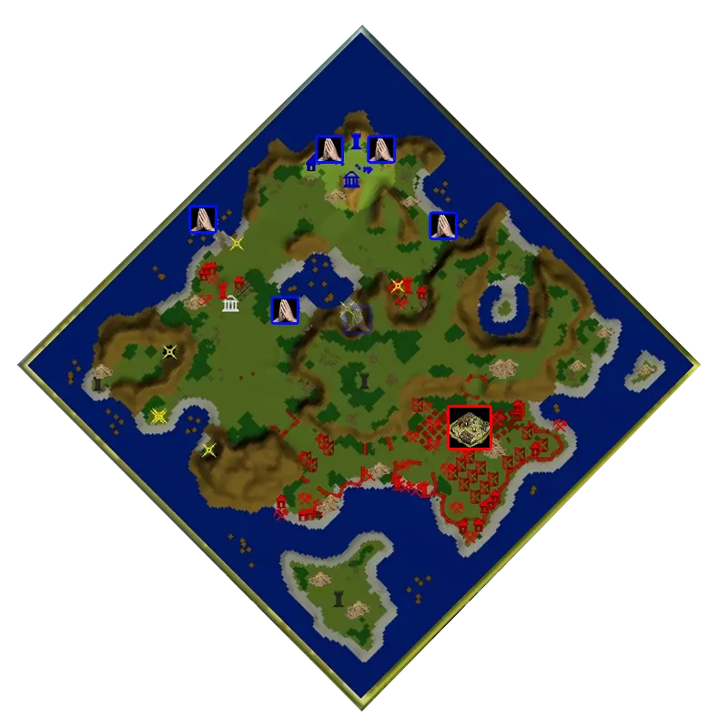 建立好防御后,我们要升级并组建军队,然后派他们前往地图北部摧毁骑兵。 不要忘记留下“敞开的大门”,这样AI就不会破坏防御,而是会从狭窄通道穿过。 阿格斯弓箭手搭配燃烧箭适合摧毁建筑。 攻击步兵村庄时,你会遭到地图东部天空通道守卫的斧掷兵小队袭击。准备好花费大量精力击退他们,因此优先摧毁骑兵是值得的。
