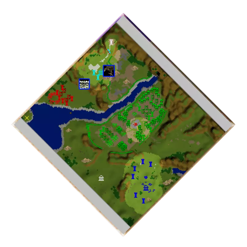 还剩下需要拯救的最后一批工人,我们向北方派出卡牌部队,将他们也解救出来。之后,我们就可以招募军队进攻地图中心。建议在四座【镜塔】之间集结军队,具体位置在敌人防御工事的西北入口处,我们将通过这里发动突袭。一定要在【商人公会】提升资源收集等级。