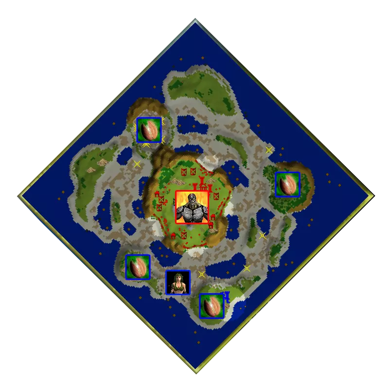 建造城镇中心后,其旁边会生长出一棵赫斯珀里得斯之树。借助它,我们可以招募树精,并与破坏者一同摧毁敌人的基地。之后只需从容重建,为进攻普罗米修斯做准备。步兵英雄非常适合这项任务。组建好军队后,在泰坦不在附近时,派遣农民建造城镇中心。不要忘记为农民配备守卫!在最南端的城镇中心附近有一件圣物——盖亚知识之书,它对泰坦能造成额外伤害,十分有用。