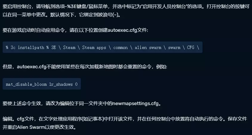 要在游戏启动时自动应用命令,请在以下位置创建autoexec.cfg文件: Program Files (x86) Steam Steam apps common alien swarm swarm cfg 右键异形丛生,属性,浏览本地文件就会直接打开 alien swarm 位置文件。这样快很多 然后在里面输入对应的指令,游戏启动的时候就能自动使用了 但是,autoexec.cfg不能使用某些在每次加载新地图时都会重置的命令,例如: mat_disable_bloom 1 r_shadows 0 要使上述命令生效,请改为编辑位于同一文件夹中的newmapsettings.cfg。 不过我还是建议写完后每局游戏运行前打开控制台输入exec cfg的名称 这样保险很多,我也不知道为啥有时候就是不能自动使用。(可能是mod的原因,游戏会优先运行mod的cfg) 我的cfg一般这样UWU: fps_max 150 mat_grain_enable 0 //禁用胶片颗粒效果 ASW _ realistic _ death _ chatter 1 ASW _ hear _ from _ marine 1//启用队员而外对话 r _ maxd lights 4//限制动态灯光为4 ASW _ camera _ shake 0//爆炸临近时禁用相机抖动 mat _ motion _ blur _ enabled 0//禁用运动模糊效果(当相机移动过快时) mat _ vignette _ enable 0//禁用屏幕两侧的“变暗” rd _ health _ effect 0//生命值低时禁用红屏闪烁 rd_hearbeat 0 //生命值低时禁用心跳声音 mat _ bloom _ scale factor _ scalar 0//禁用bloom效果 mat _ depth _ blur _ strength _ override 0//禁用深度模糊效果 net _ split packet _ max rate 120000//如果你房主,其他玩家会有更流畅的游戏 SV _ maxrate 120000//如果你房主,其他玩家会有更流畅的游戏 asw_marine_death_cam_slowdown 0//关闭死亡慢放1是开 rd_override_allow_rotate_camera 1//镜头旋转 asw_spinning_stim_cam 0 //禁用慢动作引起的小窗口 rd_ready_mark_override 1//自动准备 rd_slowmo 0//关闭所有慢放 rd_commander_cam 0 //关闭老毕登 空气大佬给的指令(作弊指令第一部分) 真的没想到,记事本701行我的妈呀 感谢大佬一个路过的空气罢了 因为这个指令合集我已经很久没更新,虫子也算半退坑了,所以嘛大家找指令还是以空气大佬的为主哈(特别声明,以下指令与本人完全无关,功劳全归属于辛勤的空气佬) 以下需要作弊权限才可以用 sv_cheats 1 生成实体指令列表: 名字: #asw_name_jaeger #asw_name_sarge #asw_name_wildcat #asw_name_wolfe #asw_name_faith #asw_name_bastille #asw_name_crash #asw_name_vegas 传送角色: bind b "asw_ent_teleport #asw_name_jaeger" bind b "asw_ent_teleport #asw_name_sarge" bind b "asw_ent_teleport #asw_name_wildcat" bind b "asw_ent_teleport #asw_name_wolfe" bind b "asw_ent_teleport #asw_name_faith" bind b "asw_ent_teleport #asw_name_bastille" bind b "asw_ent_teleport #asw_name_crash" bind b "asw_ent_teleport #asw_name_vegas" bind b "asw_ent_teleport #asw_name_jaeger;asw_ent_teleport #asw_name_sarge;asw_ent_teleport #asw_name_wildcat;asw_ent_teleport #asw_name_wolfe;asw_ent_teleport #asw_name_faith;asw_ent_teleport #asw_name_bastille;asw_ent_teleport #asw_name_crash" 补充满所有人弹药: asw_gimme_ammo 传送到角色位置 bind b "asw_teleport #asw_name_jaeger" bind b "asw_teleport #asw_name_sarge" bind b "asw_teleport #asw_name_wildcat" bind b "asw_teleport #asw_name_wolfe" bind b "asw_teleport #asw_name_faith" bind b "asw_teleport #asw_name_bastille" bind b "asw_teleport #asw_name_crash" bind b "asw_teleport #asw_name_vegas" 玩家实体: asw_marine 快捷指令: bind U "asw_ent_create asw_grenade_cluster;asw_ent_create asw_grenade_cluster;asw_ent_create asw_grenade_cluster;asw_ent_create asw_grenade_cluster;asw_ent_create asw_grenade_cluster;asw_ent_create asw_grenade_cluster" bind U "asw_ent_create asw_grenade_freeze;asw_ent_create asw_grenade_freeze;asw_ent_create asw_grenade_freeze;asw_ent_create asw_grenade_freeze;asw_ent_create asw_grenade_freeze;asw_ent_create asw_grenade_freeze" bind U "asw_ent_create asw_grenade_prifle" bind U "asw_ent_create asw_grenade_vindicator;asw_ent_create asw_grenade_vindicator" 显示指定实体的具体信息: ent_text asw_shieldbug 捆绑实体: bind o "ent_fire asw_sentry_top_machinegun SetParent #asw_name_vegas"//往指定实体上捆绑机枪炮塔头部 bind o "ent_fire asw_sentry_top_cannon SetParent #asw_name_vegas"//往指定实体上捆绑榴弹炮塔头部 bind o "ent_fire asw_sentry_top_flamer SetParent #asw_name_vegas"//往指定实体上捆绑火焰炮塔头部 bind o "ent_fire asw_sentry_top_icer SetParent #asw_name_vegas"//往指定实体上捆绑冰冻炮塔头部 bind o "ent_fire asw_ammo_drop SetParent #asw_name_vegas"//往指定实体上捆绑弹药箱 bind o "ent_fire asw_barrel_explosive SetParent #asw_name_faith"//往指定实体上捆绑t75 bind l "asw_ent_create asw_sentry_top_machinegun"//创建机枪炮塔头部 bind l "asw_ent_create asw_sentry_top_cannon"//创建榴弹炮塔头部 bind l "asw_ent_create asw_sentry_top_flamer"//创建火焰炮塔头部 bind l "asw_ent_create asw_sentry_top_icer"//创建冰冻炮塔头部 bind l "asw_ent_create asw_ammo_drop"//创建弹药盒 bind l "asw_ent_create asw_barrel_explosive"//创建t75 清除所有怪物类型实体: asw_clearhouse 移除指定的实体: ent_remove_all asw_drone 隐藏界面的所有UI: incrementvar asw_draw_hud 0 1 1 缩小指定实体的模型『警告并没有缩小碰撞箱』: ent_fire asw_drone addoutput "modelscale 0.1" ent_fire asw_queen addoutput "modelscale 0.2" ent_fire asw_marine addoutput "modelscale 0.2" 更改指定实体颜色: ent_fire asw_drone Color "64 128 128" 搜索字符串中的实体: find_ent 查看用 bind 绑定的按键: key_findbinding 显示当前位置: cl_showpos 改变当前玩家的速度: ent_create player_speedmod; ent_fire player_speedmod ModifySpeed 3 32号事故彩蛋点坐标: 信息部 setpos 522.16 2250.22 410.82 反应堆 setpos 6500.20 1900.69 200.82 研究中心 setpos 2887.65 7956.70 -150 连接点 setpos 2300.48 1457.14 150.82 实验室废墟 setpos 5088.65 2888.55 250.82 在公告上说话: sc