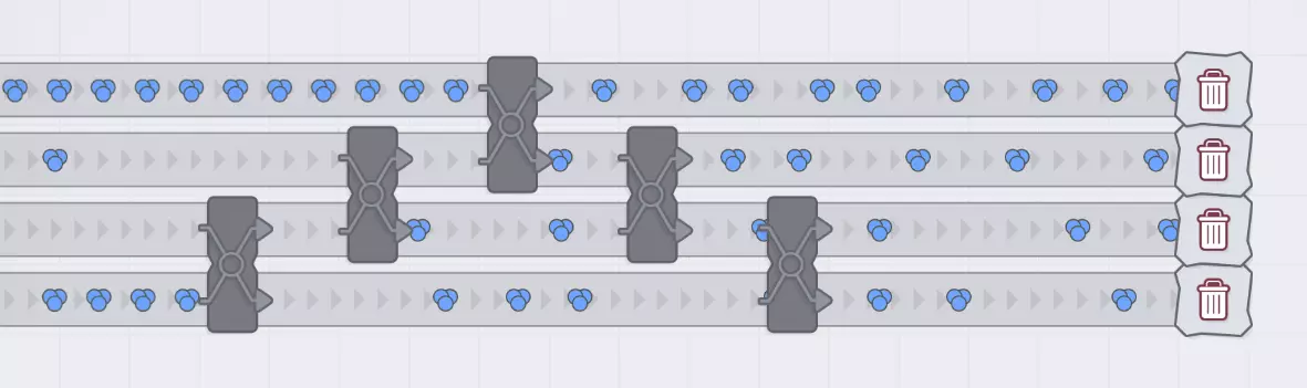 实际上,强烈建议尽快将多条使用率低的传送带合并到一条满载的传送带上,因为这比并排运行多条传送带能省去大量麻烦。 最后一点,平衡器可以尝试平衡两条输入传送带和两条输出传送带的负载,但当输入输出超过两条时,情况会变得更加复杂。平衡器无法将一条传送带上超过50%的物品转移到另一条传送带上,因此,例如要实现四条传送带的完美平衡,就需要比下面的简单示例更巧妙的设计。