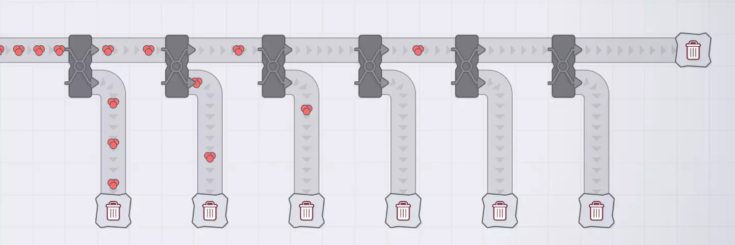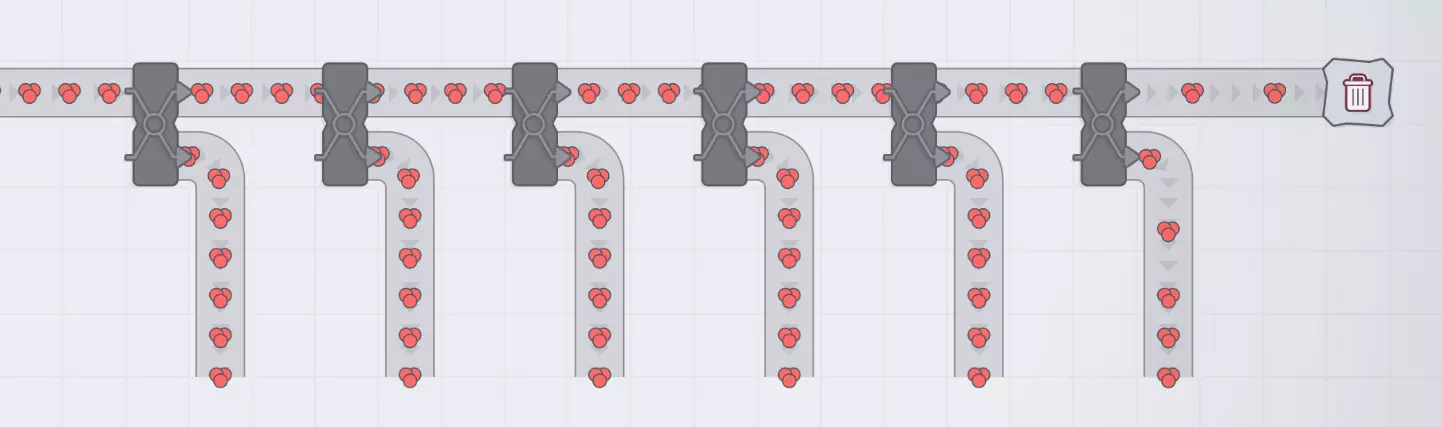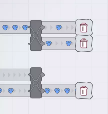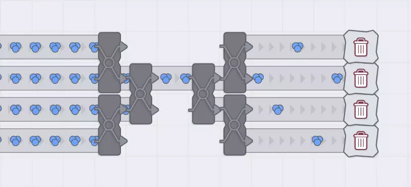 你可能会想“这不行,因为每个分流器都将流量分成两半,所以传送带会得到1/2、1/4、1/8、1/16、1/32、1/64等流量,就像某种传送带版的芝诺悖论”。 如果传送带是通向垃圾桶、交付中心或其他处理速度非常快的地方,这种想法是正确的。 但如果它们通向处理速度较慢的设备,那么这些设备会立即堵塞,而分流器会绕过任何堵塞的传送带。因此,如果这些分支通向设备,所有物料都会到达设备,最后一个设备会“刚好及时”收到物料。除非你的设备总处理速度超过了单条传送带的容量(如果你的设备速度升级领先于传送带升级,这种情况可能暂时发生)。