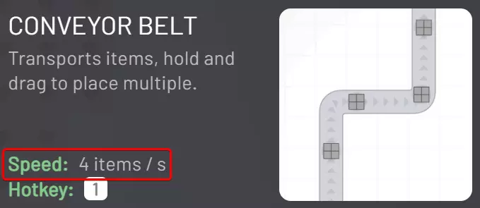 当选中机器的工具按钮时,你还可以在同一位置查看各种机器的速度。 如果某台机器在你当前的升级下,输出速度为1个物品/秒,而你的传送带容量为4个物品/秒,那么你需要四台该机器并行运行才能完全填满输出传送带。 计算相当简单,但要注意瓶颈问题,因为整个生产线的速度会受到速度最慢环节的限制。 此外,只要保持速度升级处于同一水平,填满输出传送带容量所需的特定类型并行机器数量就应保持不变。因此,通常不需要调整并行阵列中的机器数量。平衡器的工作方式符合预期 大多数情况下,平衡器的工作方式符合预期。 它们是连接和分流传送带的主要方式: