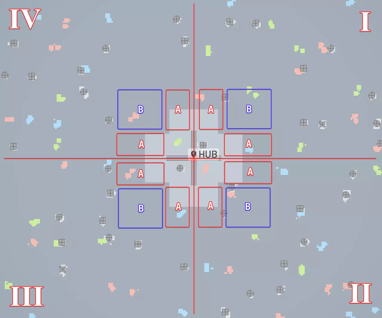 显然,你会想要获取那些通常离枢纽非常近的资源,但只需将它们移到缓冲区外使用,并尽量保持该区域除资源收集器和运输传送带外无其他物品。 部分原因是:你最终可能想在这里建造一些复杂的负载平衡设施,这会占用大量空间。实际上,它可能会占用更多空间,但目前我认为不必为此担心。 将地图划分为象限,并预留4条“轴线”行/列用于传送带 我建议这样划分地图,从枢纽开始向上下左右四个方向无限延伸,各铺设四条传送带。