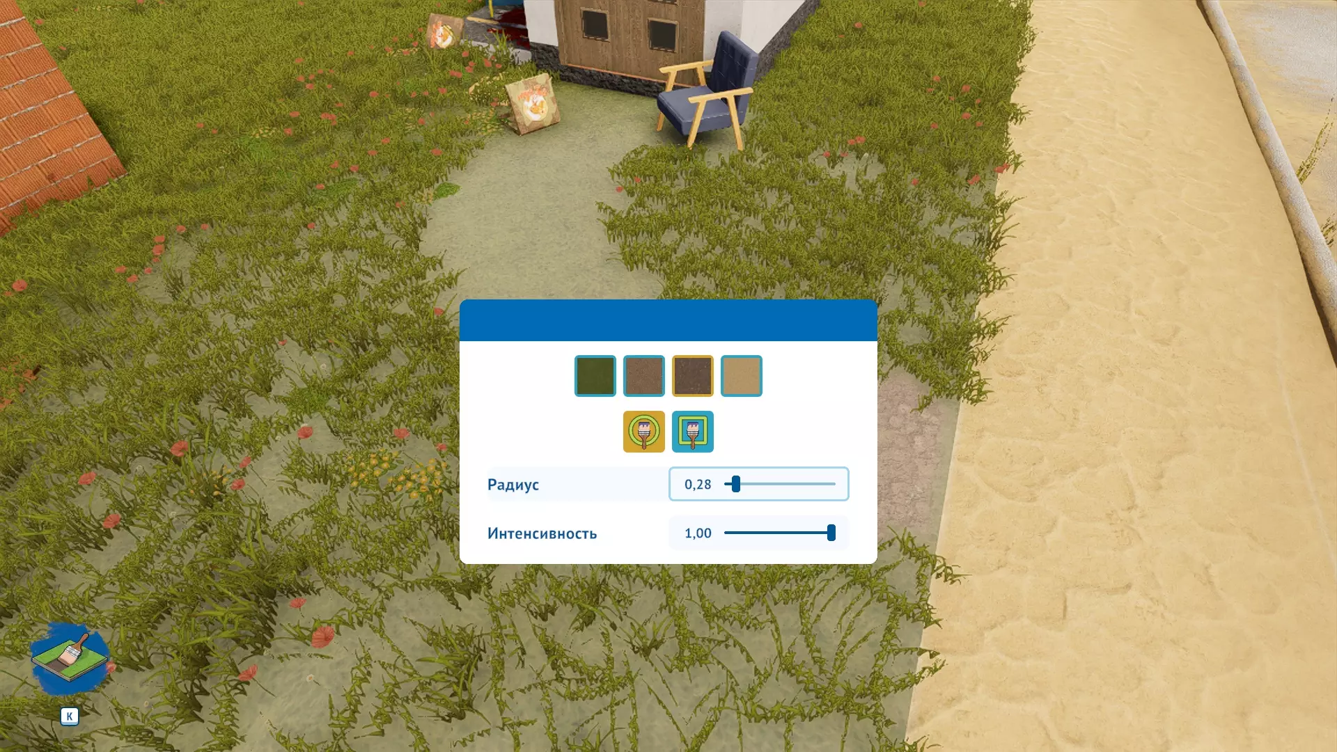 12. 土地染色工具和草地修改工具 草地修改工具可用于精细调整草坪。很合理。你很可能想修剪草坪,或者相反,让草只在特定区域生长。 选择该工具后,按K键会打开控制面板。我想在我漂亮的小屋旁开辟一条小路,所以我要修剪草坪。选择“无”类型的修改,它可以帮我清除杂草。转动鼠标滚轮可以改变工具的作用半径。在需要的地方清除杂草。 选择“土地染色”工具。该工具的控制面板同样按K键打开。顺便说一下,工具生成的这个浅色圆圈并非其作用半径。 在控制面板中选择我们需要的图案。我用圆形选择了土地和覆盖物,方形覆盖物不适合我。这里一切都很简单。