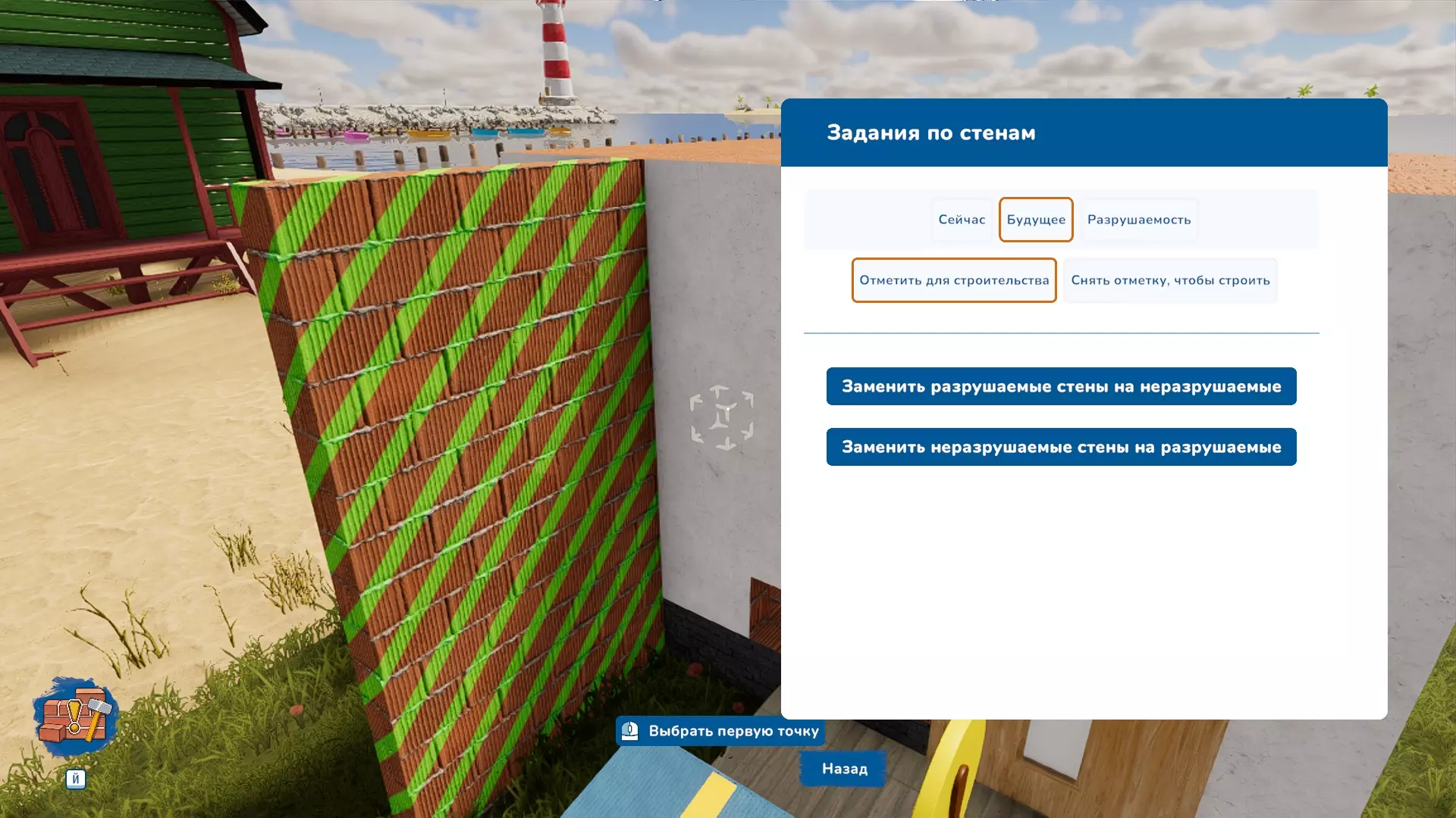 这里已经弄清楚了。 9. 建造和拆除墙壁的任务 接下来我们看看“墙壁任务”工具。选择它,直接按Y键。 也就是说,我们将创建一个任务,玩家需要根据该任务拆除或建造墙壁。我觉得这个工具是最繁琐的。 这里同样适用“未来”和“现在”的原则,只是可以通过跳转到相应的部分来切换这两种模式。如果我们想让玩家拆除墙壁,选择“现在”和“标记为拆除”。如果改变主意想取消标记,右侧的按钮可以修正状态。选中要拆除的墙壁,它现在会以红色闪烁。