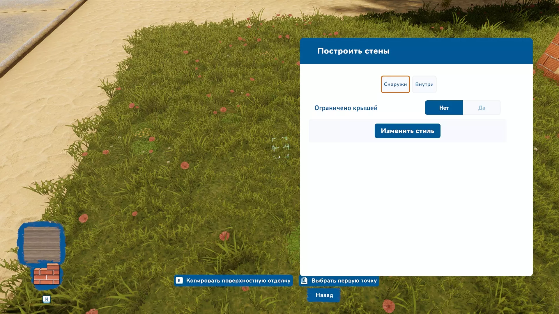飞行模式可通过以下3种方式开启: 1. 进入工具菜单,点击底部的【飞行】按钮(操作不便)。 2. 按下【P】键。 3. 像《我的世界》那样,即连续按两次空格键。 :) 飞行控制方式: 1. 【Shift】键 - 加速。 2. 【空格键】 - 飞得更高。 3. 【C】键 - 下降。 在沙盒模式中,开发者还还原了世界上最神圣的功能,也就是类似【Ctrl+Z】的撤销功能。这个神圣的组合键可以撤销我们在图像处理软件、绘画软件和3D程序中的最近操作。而在游戏中,只需按下【Y】键就能撤销操作,比如撤销建造或拆除墙壁,取消不小心选择的覆盖物,总之能快速让一切回到应有的初始状态。如果你建好了一个房间又改变了对它用途的想法,这个功能会非常有帮助。这是基础操作 :) 简单工具: 需要记住的新内容:几乎每个工具按【Y】键(其他情况下按【K】键)都能打开控制面板。例如,选择“建造墙壁”时,可以在“更改样式”中设置墙壁的材料和颜色,直接建造出带有该材料的墙壁。很方便!