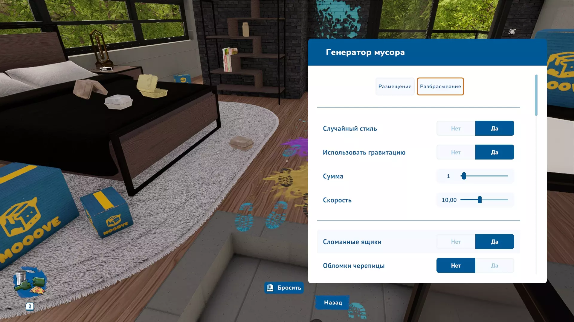 现在我们的左键(LKM)上新增了【丢弃】按钮。按住Alt键并滚动鼠标滚轮(СКМ)可以更改垃圾模型。按住Ctrl键可以旋转模型本身。 尽情扔垃圾吧。 如果是破损的箱子,例如,你可以移动它的各个碎片。其他一些类型的垃圾也有此特性,但如果你不喜欢当前位置,之后都可以移动它们。