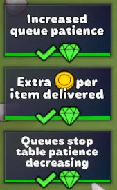 图片上显示有两个盘子,但我只放了一个。 2. 冰淇淋-2枚硬币。冰淇淋甜点有三种口味(颜色)。顾客可以点全部口味或单个口味。 3. 咖啡杯-1枚硬币。制作简单,不需要盘子。 4. 苹果派-不记得多少硬币了 室内风格。 1. 领带-这种风格我们已完全解锁。 阶段1:0/3的顾客留下更少的污渍。 阶段2:3/6的顾客在拿到食物时会提高自己的耐心。第三阶段:6/9 桌子不会留下污渍。 2. 房屋 - 此类型已完全解锁。 第一阶段:0/3 增加顾客耐心值(铃铛)。 第二阶段:3/6 当玩家在桌子旁时,顾客耐心值下降速度变慢。 第三阶段:6/9 顾客会在桌子被清理前就坐下。 3. 钻石 - 此类型已完全解锁。 第一阶段:0/3 增加排队耐心值。 第二阶段:3/6 交付商品可获得额外金币。第三阶段:6/9 排队可阻止餐桌前的耐心值减少。