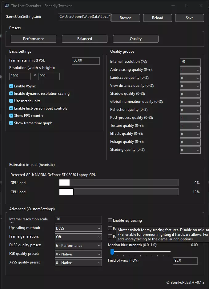 为直观展示设置对游戏的影响,已添加处理器和显卡负载的启发式刻度。这些刻度不反映硬件的实际负载,而是显示从最高到最低的相对负载,这非常有帮助。 为获得最佳性能,需在游戏启动参数中添加-noraytracing。如果您想手动更改参数,而非使用预设,每个参数都添加了悬停提示,其中包含其功能描述以及对性能的影响。 附:抱歉,几乎没有时间进行测试,如果出现问题,请告知我,我会尽量抽出时间来修复。 此优化工具是为那些遭受卡顿困扰以及难以自行设置最佳参数的玩家创建的。优化器会根据已安装的显卡自动确定最合适的 upscale 参数。 为了直观显示设置对游戏的影响,已添加处理器和显卡负载的启发式量表,这些量表不反映硬件的实际负载,而是反映从大到小的相对负载,这非常有帮助。 为获得最佳性能,需在游戏启动参数中添加 -noraytracing。 如果想手动更改参数而不使用预设,将鼠标悬停在每个参数上会显示提示,说明该参数的作用及其对性能的影响。抱歉,几乎没有时间进行测试,可能会存在问题。若发现问题请告知,我会尽量抽出一小时来修复。
