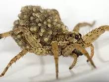 狂暴狼蛛展现出它的反光眼睛 狼蛛的确切种类尚有争议,但最有可能是“条纹狼蛛”或“狂暴狼蛛”。两者在外观上相似,不过狂暴狼蛛(注:它们实际上并不携带狂犬病)的活动极为活跃。 狼蛛通常是夜间捕食者,它们利用巨大的反光眼睛在黑暗中发现猎物。与大多数蜘蛛不同,狼蛛是主动捕食者,不会结网(但它们的洞穴会覆盖蛛丝)。它们的移动速度极快,地面速度可达0.6米/秒,很容易被认为是其体型等级中的顶级捕食者。