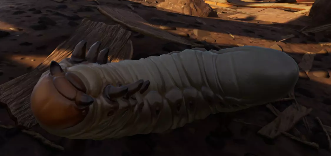 象鼻虫是草食性甲虫,它们用隐藏在喙(口鼻部)中的口器取食植物。在《禁闭求生》中,它们是倒霉的小甲虫,几乎会被所有能攻击它们的生物捕食,这似乎很合理。游戏中的象鼻虫属于象甲科,被称为“真象鼻虫”。青铜苹果树象鼻虫正常观察时呈黑色,但会反射出青铜色光泽,与游戏中看到的象鼻虫特征最为相似。 蛆虫 - 六月鳃金龟蛆虫(鳃金龟属)