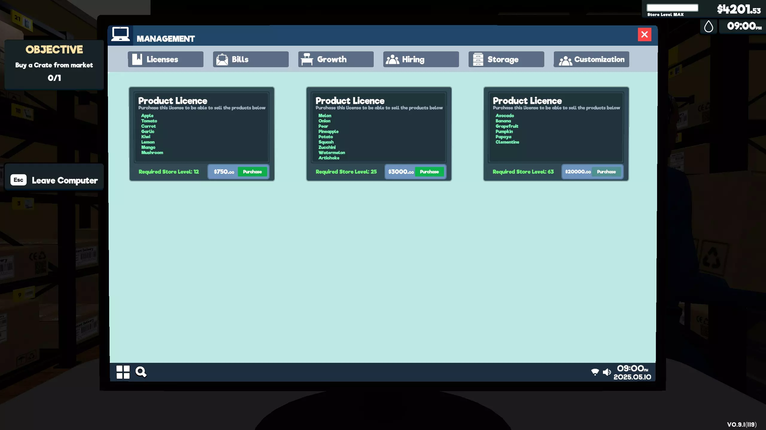 最棒的! 购买所有扩展内容。 这是一个长期成就。在电脑的管理界面中,你需要为商店和仓库购买所有扩展内容。 你可以通过提高商品价格来最大化利润。你设定的价格越高,顾客因价格过高而不购买商品的几率就越大。购买许可证以解锁更多可销售的商品。通过升级,你每天获得的顾客数量会增加。随着等级提升,你每天可解锁的顾客数量上限也会提高。