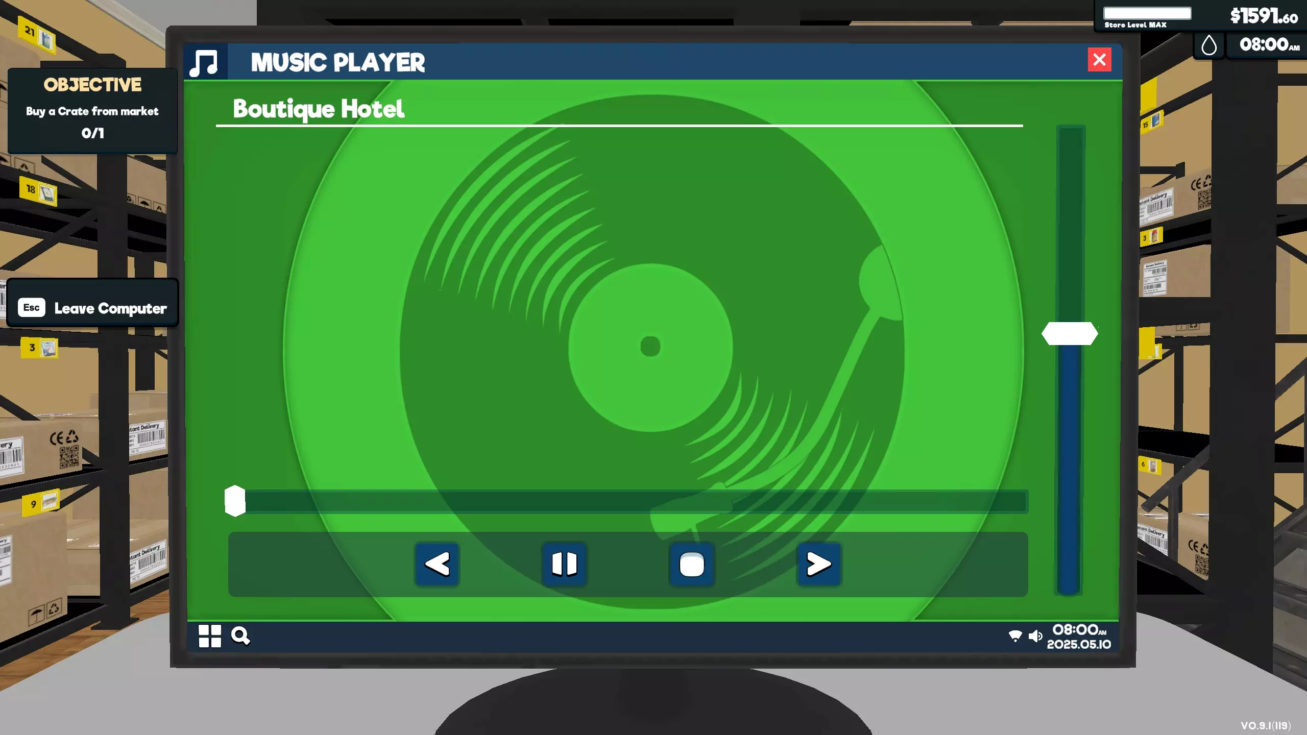 电梯 播放音乐播放器中的歌曲 从商店电脑市场的家具界面购买一个扬声器,并将其安装在某处的墙上。返回商店电脑,打开音乐播放器并按下播放键。