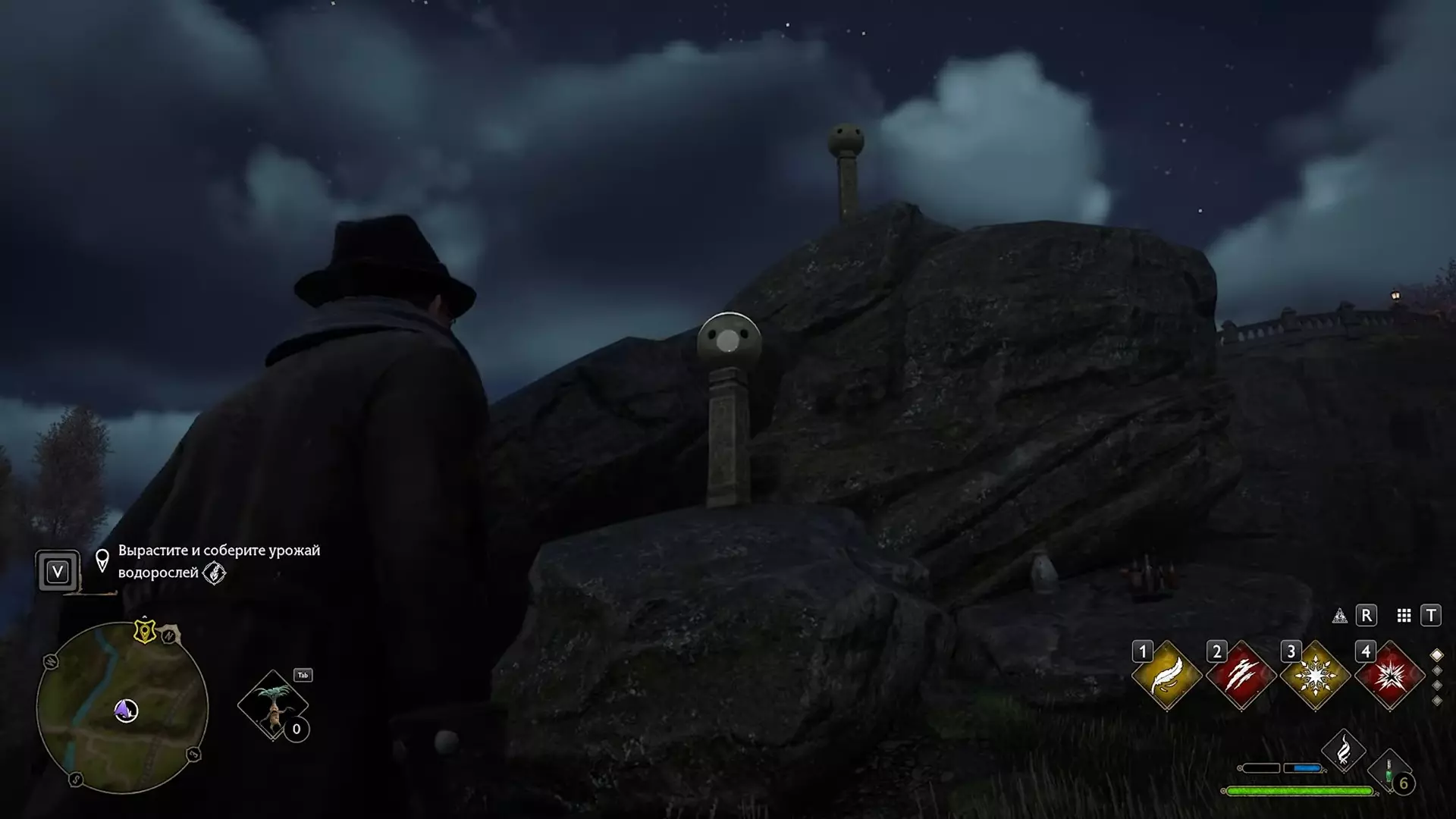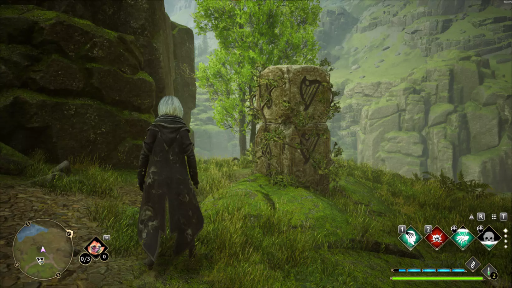 3)蝴蝶与石制立柱: 环顾四周——你会看到一群蝴蝶。靠近它们并使用【荧光闪烁】,将昆虫吸引到魔杖上。 然后将蝴蝶带到每根有孔洞的石头旁。当昆虫飞进石头后,石头会发光并被绿色覆盖。 对所有石头重复此操作,即可完成试炼。