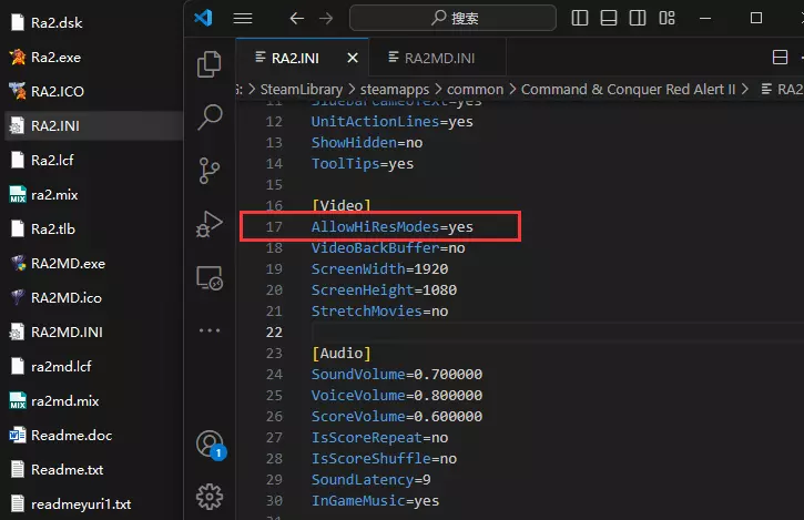 显示全分辨率解锁:在库右键点击【《命令与征服:红色警戒 2 及尤里的复仇》】,选择【管理】,选择【浏览本地文件】,在打开的文件夹内找到并分别打开【ra2.ini】和【ra2md.ini】,在【[Video]】键值下面加上【AllowHiResModes=yes】即可。