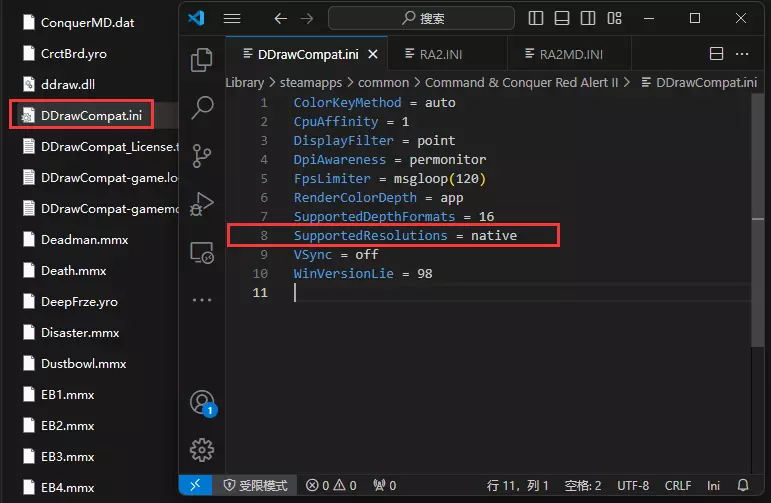 如果兼容层已更换,请忽略后续步骤。 在打开的文件夹内找到并打开DDrawCompat.ini。 根据该工具的Wiki说明,将SupportedResolutions所在行改为SupportedResolutions = native即可,无需手动定义大量分辨率。 此设置表示兼容层将不限制程序支持的分辨率,支持分辨率将由被运行的程序本身决定。