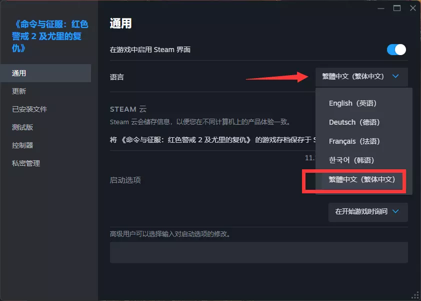 切换游戏为繁体中文:在库中右键点击【命令与征服:红色警戒2及尤里的复仇】,选择【属性…】,在【通用】中找到【语言】,选择【繁体中文】,更新游戏后即可使用繁体中文进行游戏。