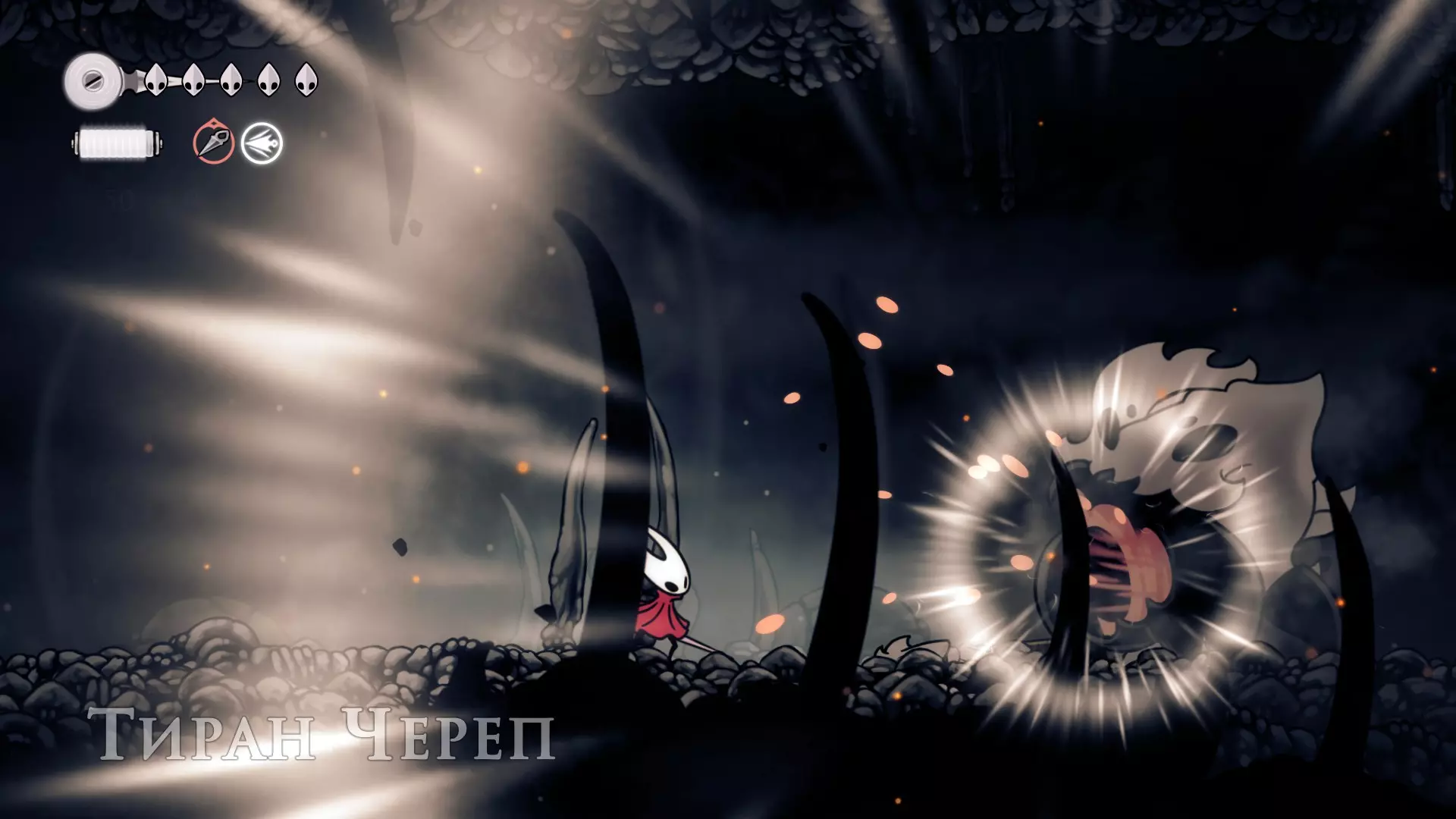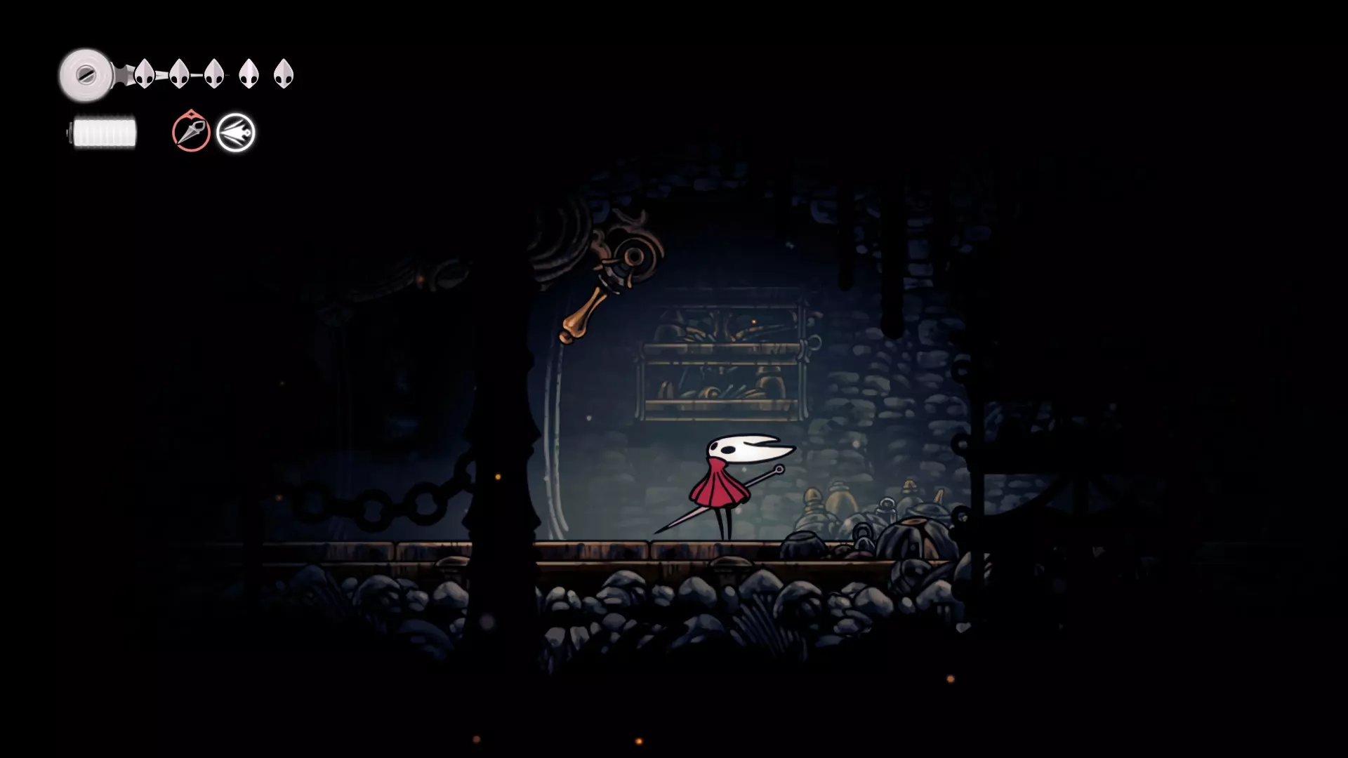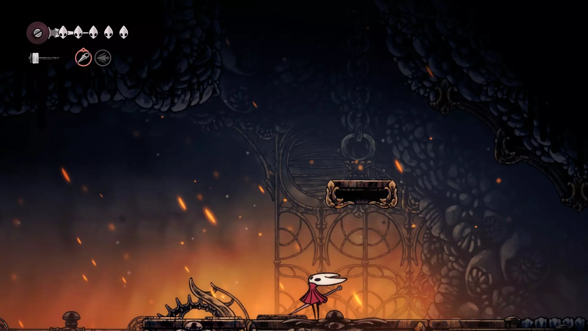 从右侧上去后,可以从线轴上拾取一些丝绸。向左走,但不要急着往上走,因为如果死亡的话,不想再走这条路了,所以向左走到尽头,用杠杆打开之前关闭的门。好了,现在可以向右前往 Boss 处了。 Boss 战策略