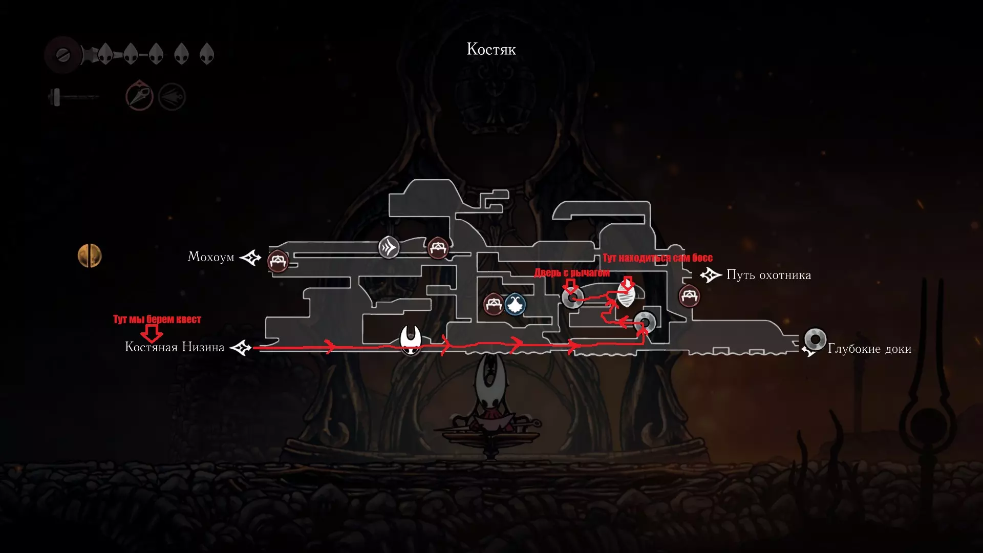 我在地图上标记了各个物品的位置。 如何接取任务? 要接取任务,需要先找到【粘性抓取】技能,之后在主村【骸骨山谷】的任务板上可以接取任务“Жуткий Тиран”。