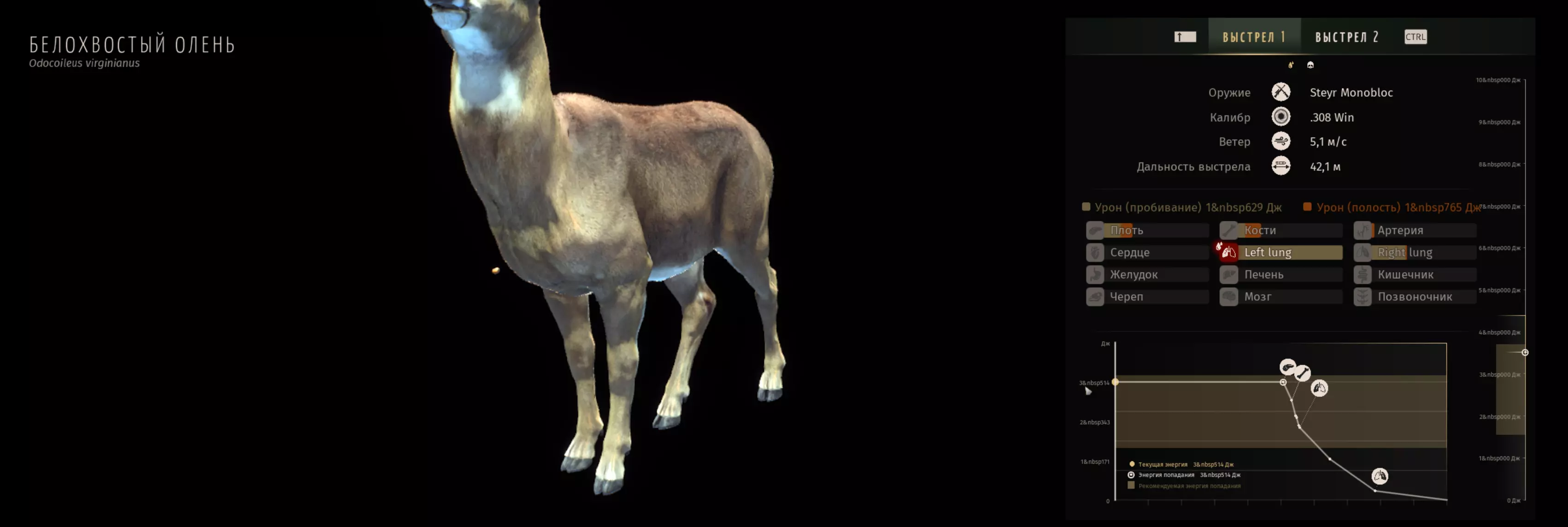 Результат выстрела зависит от энергии и траектории пули на момент попадания и после него. Раненое животное всегда истекает кровью. По цвету крови можно определить, какие органы были поражены. Мозг и позвоночник: красная. Сердце, легкие и артерии: розовая. Печень: темно-багровая. Желудок и кишечник: с зелеными вкраплениями. Кости и мышцы: красная. Пуля всегда должна попадать в цель с рекомендуемой энергией попадания. В этом случае она проникнет достаточно глубоко и создаст достаточно большую полость в теле животного, чтобы нанести смертельный урон. Ваша задача — быстро подстрелить животное, не создавая для него лишних мучений. РЕАКЦИЯ НА ВЫСТРЕЛ, ПОВЕДЕНИЕ ЖИВОТНОГО ПОСЛЕ ВЫСТРЕЛА То, как животное немедленно реагирует на выстрел. По реакции животного вы можете узнать, насколько удачным был выстрел. Поведение животного зависит от повреждения его внутренних органов. Органы могут быть поражены непосредственно пулей или раневым каналом — полостью, образующейся вокруг пули. Обычно животные реагируют одним из следующих способов. 1 Животное сразу падает на месте после попадания: гибель наступает быстрее всего. Это происходит при попадании в жизненно важные органы. Это также произойдет, если вы выстрелите животному в череп, но имейте в виду, что выстрел в голову не считается этичным и необратимо портит трофей. 2 Животное быстро бежит прочь, спотыкаясь по пути, все медленнее и медленнее: вам удалось сделать хороший выстрел, но животному требуется больше времени, чтобы погибнуть. 3 Животное быстро бежит прочь, все медленнее и медленнее, затем ложится и умирает: не самый лучший выстрел. Такое может произойти, если вы используете неправильный калибр, пробили брюхо но почти не задели жизненно важные органы. Вы должны быть осторожны, подходя к животному, которое было ранено таким образом, даже если оно в шоке, вы можете спугнуть его еще дальше, и вам придется искать его снова, чтобы добыть. 4 Животное быстро бежит прочь, все медленнее и медленнее, затем ложится, чтобы отдохнуть: легкое ранение, животное придет в себя через какое-то время. Проявляйте крайнюю осторожность, когда выслеживаете животное, раненое таким образом вы можете спугнуть его еще дальше. 5 Животное быстро бежит прочь без последствий: вы лишь напугали его или едва ранили. Через некоторое время кровотечение прекратится, и оно полностью придет в себя ЗВЕРИНЫЕ ТРОПЫ И ИХ ЖИЗНЕННЫЙ ЦИКЛЗвериные тропы Звериные тропы — это соединительные линии между их зонами потребностей. О том, как животные пользуются тропой, вам расскажут их следы. Следуя по любой тропе, вы всегда придете к зоне потребностей животного. Чтобы найти звериную тропу, следите за примятой травой и протоптанными линиями на земле. Вам будет проще обнаружить их, выделив некоторые признаки с помощью охотничьего чутья: для этого нажмите Q. Чтобы получить больше информации о тропе, используйте функцию взаимодействия с тропой. Только крупные травоядные животные оставляют видимые следы в траве. Жизненный цикл Крупная дичь — перемещается между зонами питания, водопоя и отдыха. Они никогда не перемещаются между двумя зонами одного типа (например, из зоны водопоя они не пойдут в другую зону водопоя: Все пути между зонами хорошо различимы, и отследить их несложно. Хищники — обычно живут внутри своей большой зоны кормления, ряд