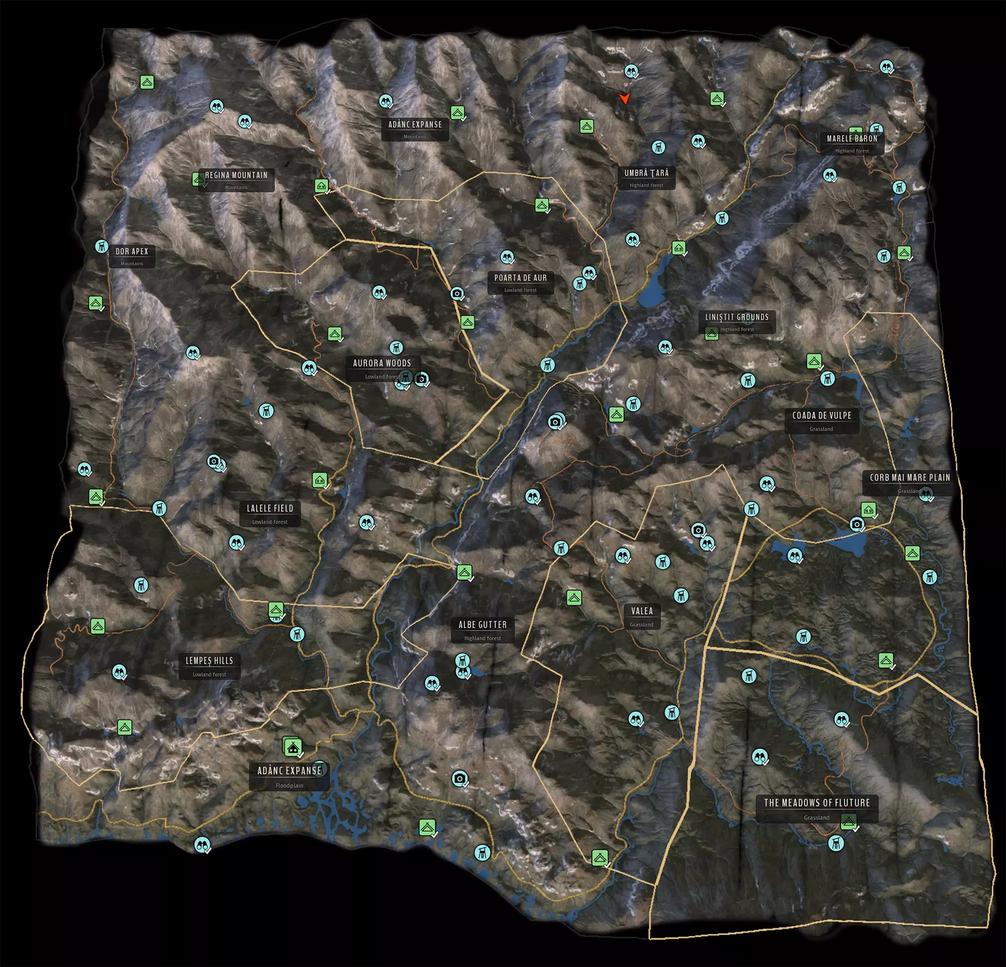 诱饵: 熟练的猎人可以用诱饵引诱动物靠近自己的位置。为此,你需要购买针对目标动物的诱饵。例如,使用鹿诱饵可以让雄鹿以为附近有雌鹿。另一方面,掠食者也可能会上当,尤其是对受伤或虚弱猎物发出的声音。购买诱饵并携带它去狩猎时,请记住要明智地使用。如果您使用诱饵时不够谨慎或过于频繁,动物可能会注意到您并逃跑。使用诱饵后,请保持安静,并且在一段时间内(每种诱饵都有特定的间隔时间)不要再使用——否则动物会察觉到异常。 当您在一段时间内首次使用诱饵时,它通常会成功吸引动物靠近。为了更强地引诱她,需要等待足够的时间并再次使用诱饵。留意诱饵指示器,当它接近刻度中间时使用。 诱饵等级: 有些诱饵是为更有经验的猎人设计的。诱饵最多可以有三个等级。要解锁更高等级的诱饵,必须先解锁某些技能。 已开放地图 内兹-佩尔山谷