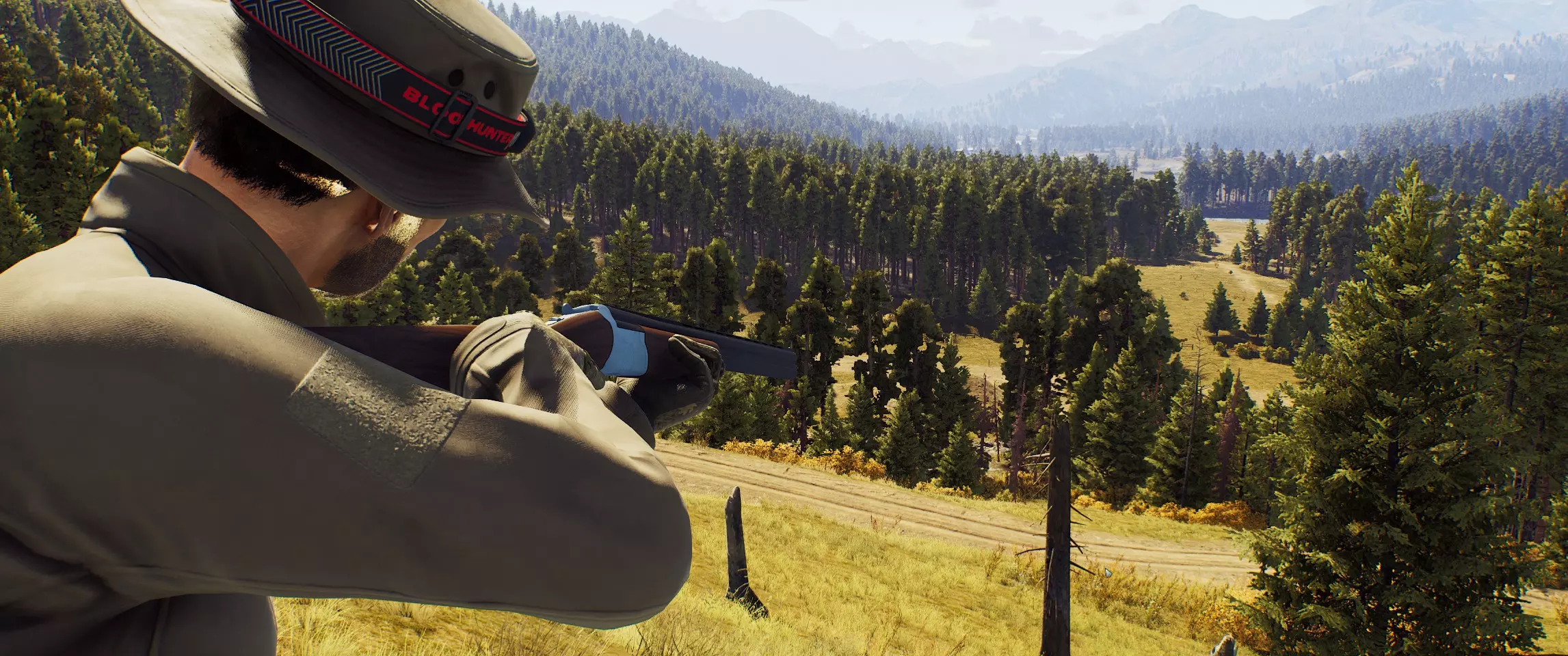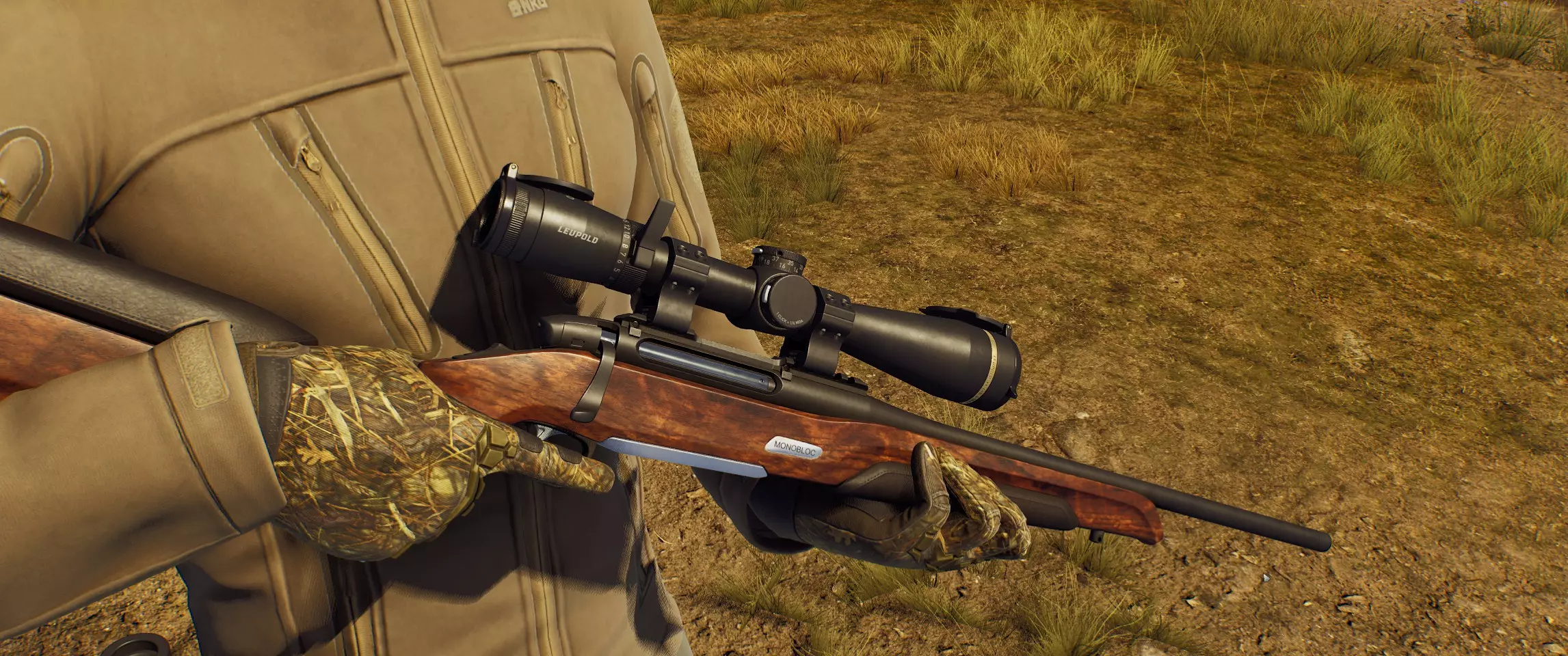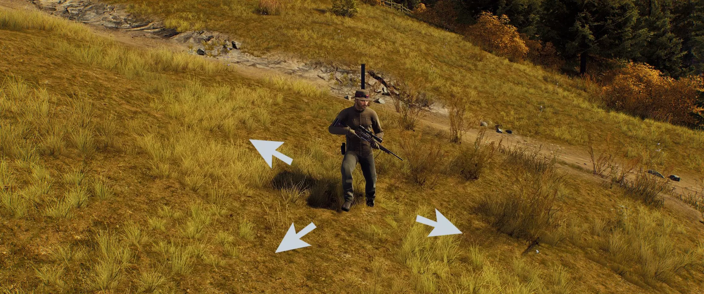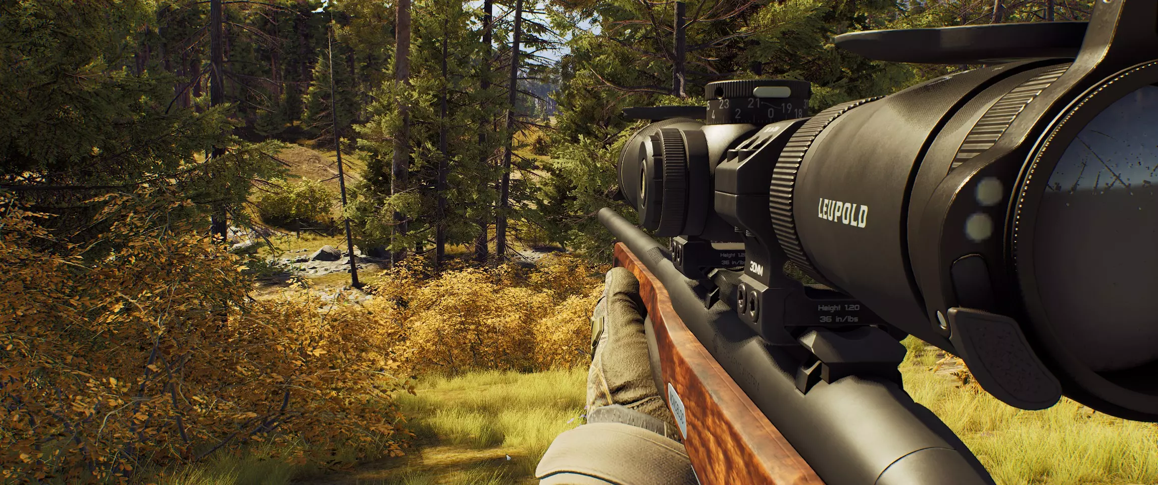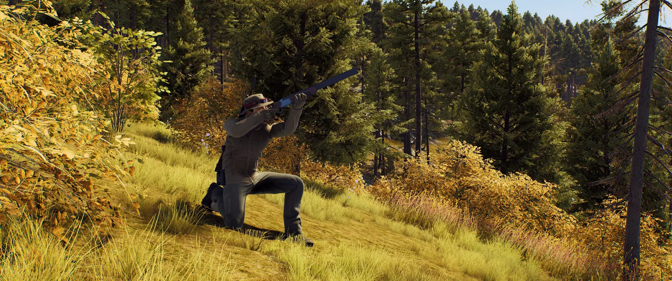 姿势(或姿态)是你可以采取的一种姿势,用于更好地射击或隐蔽。游戏中有三种基本姿势。 坐姿: 当你处于站立姿势时,按C键即可坐下。 此姿势下武器的晃动幅度比站立时小。坐下时,中等高度的草可以为你提供掩护。 卧姿: 按住C键即可卧倒在地。此姿势下武器的晃动幅度比其他姿势小得多。在卧倒姿势下,即使是矮草也能为你提供良好的掩护。 站立姿势 要从坐姿起身,按C键。你也可以从卧倒姿势下双击C键或按住C键起身。 【狩猎技艺、成就与技能】 狩猎技艺: 要成为更成功的猎人,别忘了提升你的狩猎技艺。您的游戏熟练度等级与成就和技能相关联,这些将影响您的射击质量及其他狩猎技能。若要了解详情,请点击并打开【角色—技能】页面。 成就: 完成成就条件后,您将自动解锁相应技能。 技能: 技能是完成相应成就后解锁的特殊效果。它们绝对值得你花时间,因为能让狩猎过程更轻松,或者带来全新的狩猎方式。 生命值 从高处坠落: 从足够高的地方坠落可能会导致受伤。建议:最好不要从岩石上跳下去。请运用常识! 深水和溺水风险: 你能屏住呼吸多少秒?如果你背负着重物,这一点都不重要。如果不想溺水,就不要进入深水区! 汽车事故: 人类是脆弱的生物,即使在车里也是如此。高速行驶时与障碍物碰撞不仅会损坏车辆,还会对您造成伤害。 野兽袭击: 有些动物在遇到危险时不仅会逃跑,还会向您发起攻击!动物体型越大,这种攻击对您的健康就越危险。模块、瞄准镜、校准、后坐力 要为武器装配模块,需打开猎人小屋或汽车后备箱中的储物箱,然后选择所需部件。你只能为武器安装已拥有的光学瞄准镜,也可以卸下瞄准镜,用老式的机械瞄准具进行狩猎。同一个瞄准镜可用于多种武器。光学瞄准镜是一种带有瞄准刻度的透镜系统,用于简化子弹飞行轨迹的计算。这类瞄准镜适用于不仅需要精确瞄准,还需要更好观察目标的场景。光学瞄准镜最适合中远距离射击,当动物表现平静,且猎人有足够的时间和空间找到舒适的位置、瞄准并射击,避免给动物造成多余痛苦时使用。 准直式瞄准镜是一种光学瞄准镜,使用时需要将镜片上投射的激光标记与目标对准。此类瞄准镜常用于近距离和中距离对快速移动目标进行射击,此时猎人不仅需要看到动物,还需要观察周围环境。 开放式瞄准镜由准星和照门组成,为了精确命中目标,瞄准时常需要以特定方式将两者对齐。 武器晃动指的是瞄准过程中枪管的移动,屏住呼吸可以消除这种晃动。后坐力是射击武器开火时产生的反作用力,会导致瞄准偏移。 为了降低后坐力并看清弹着点,开火时不要松开鼠标左键: 【望远镜:说明】